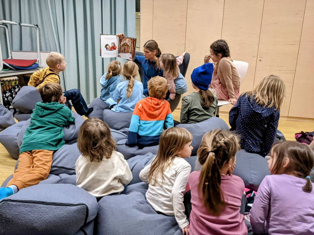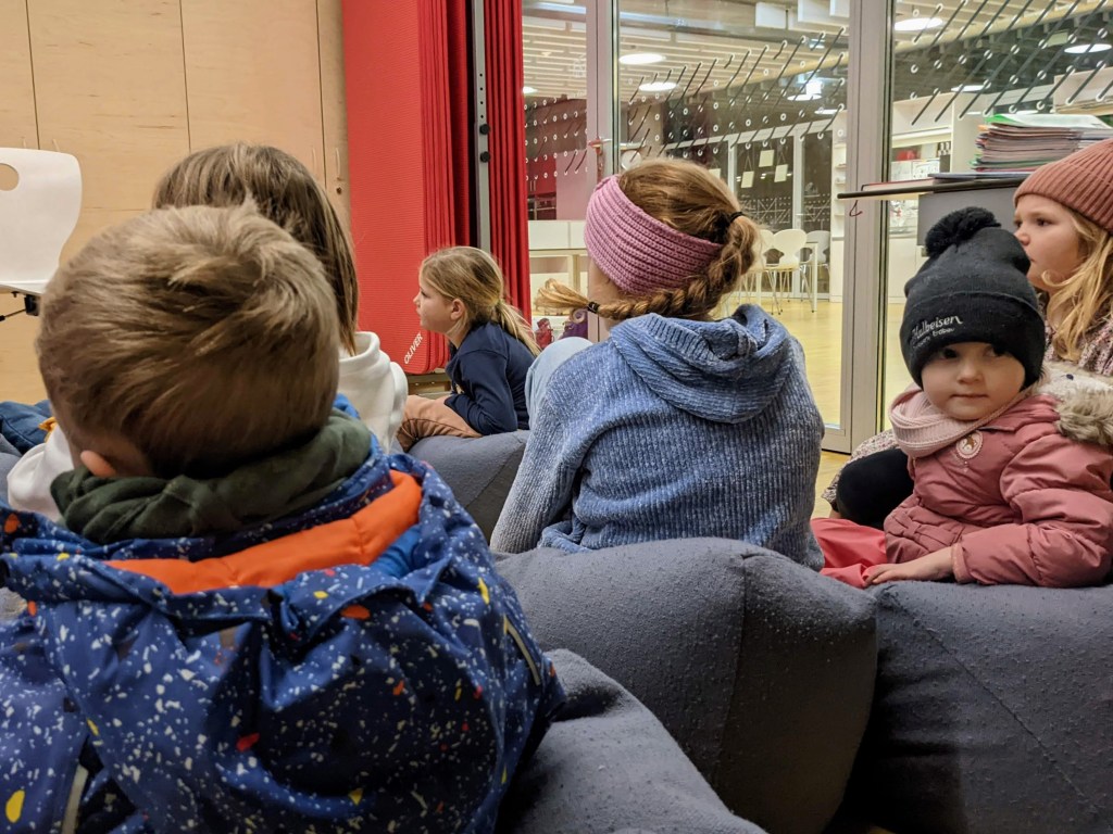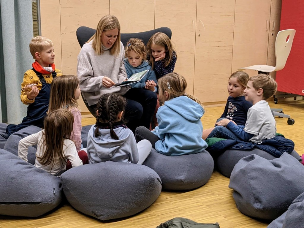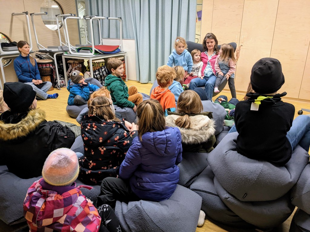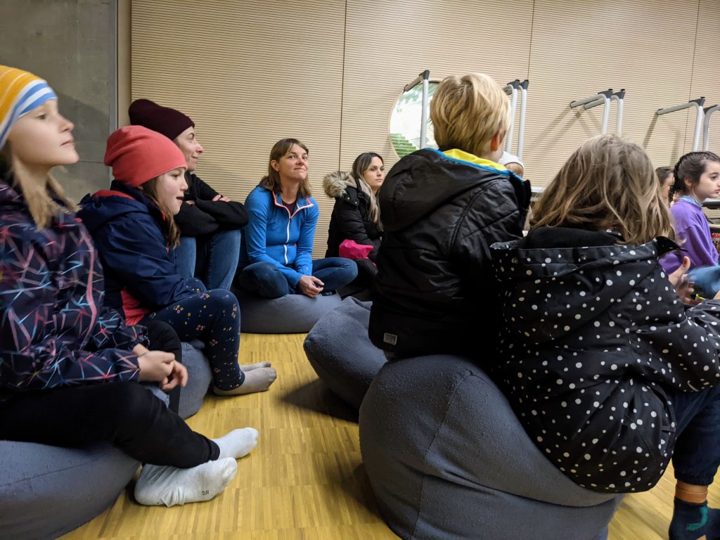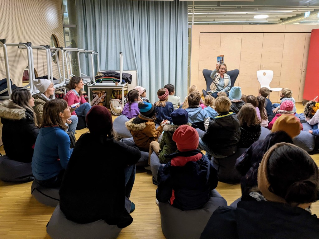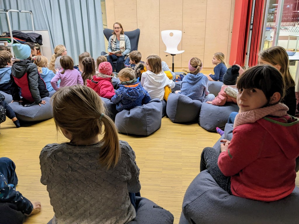 Zum Aufwärmen und Ausruhen wurde das Musikzimmer in ein gemütlichen Leseraum umgewandelt. Eltern lasen für die Schüler*innen Geschichten vor.
