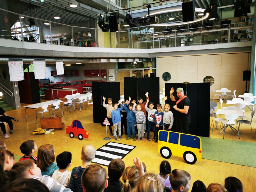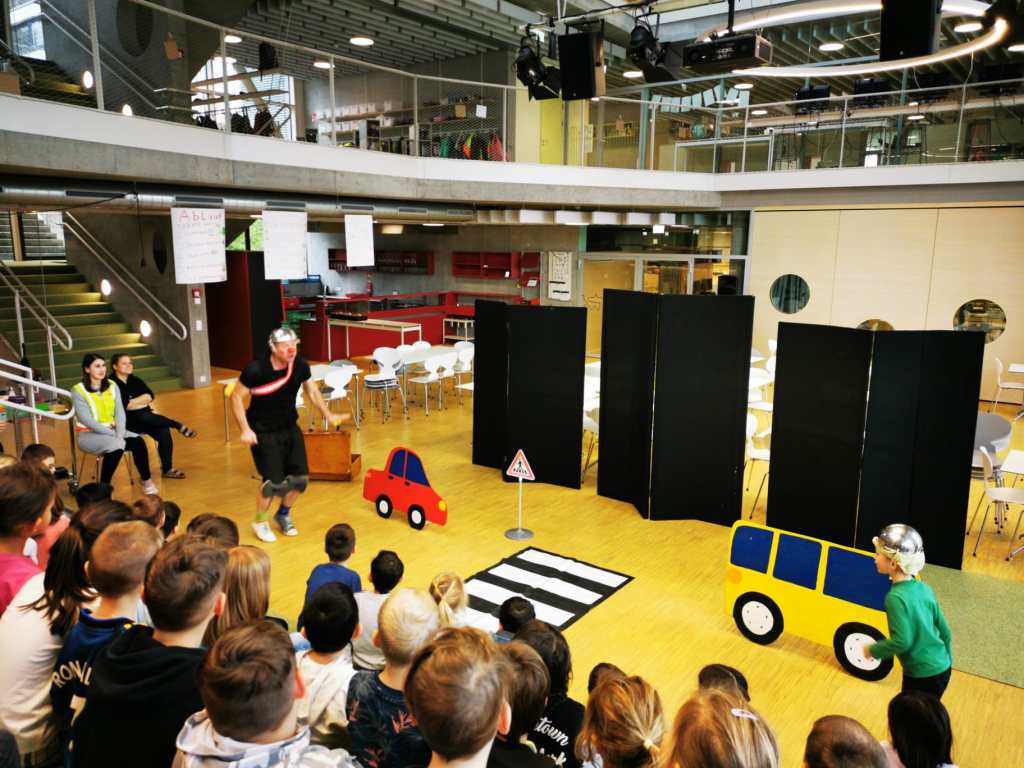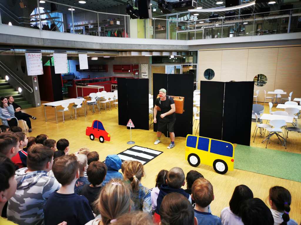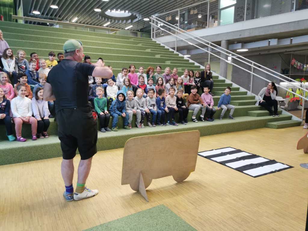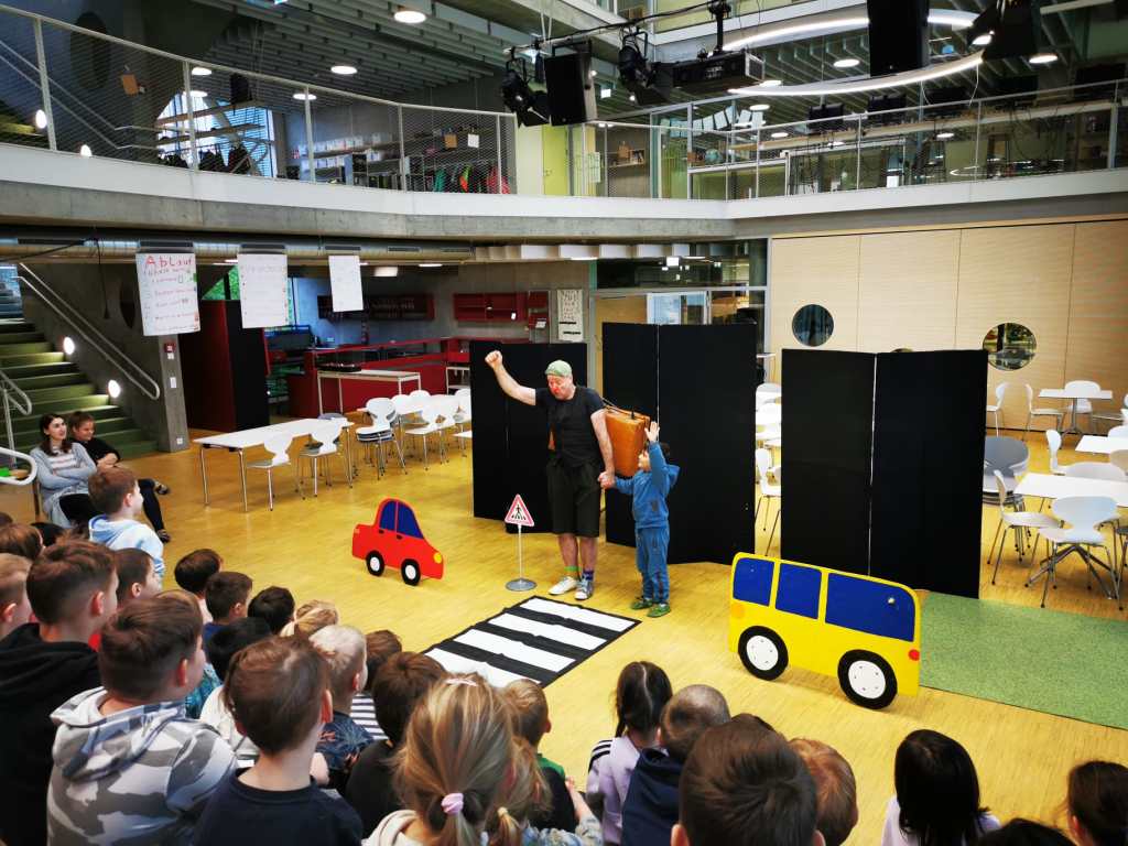 Auf spielerische Art und Weise trägt das wertvolle Schauspiel dazu bei, Gefahren auf der Straße zu erkennen und richtiges Verhalten einzuüben. Mit Schwung, Energie und viel Spaß brachte er den Kindern und sogar den Lehrerinnen bei, wie man richtig über die Straße geht. Danke Thiemo für deinen immer so erfrischenden Einsatz.