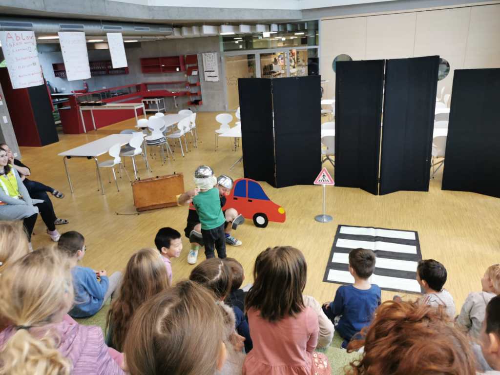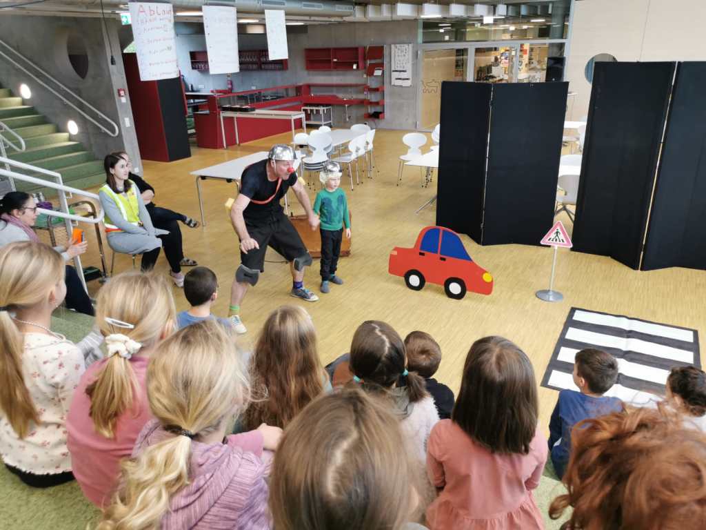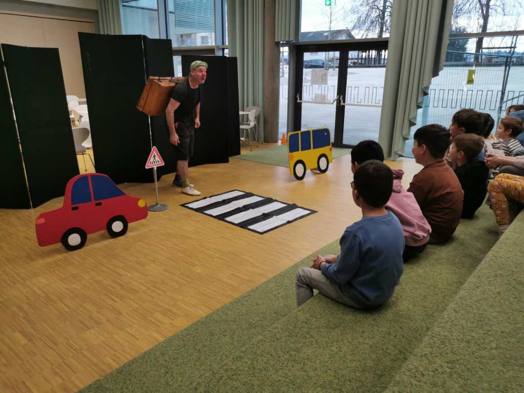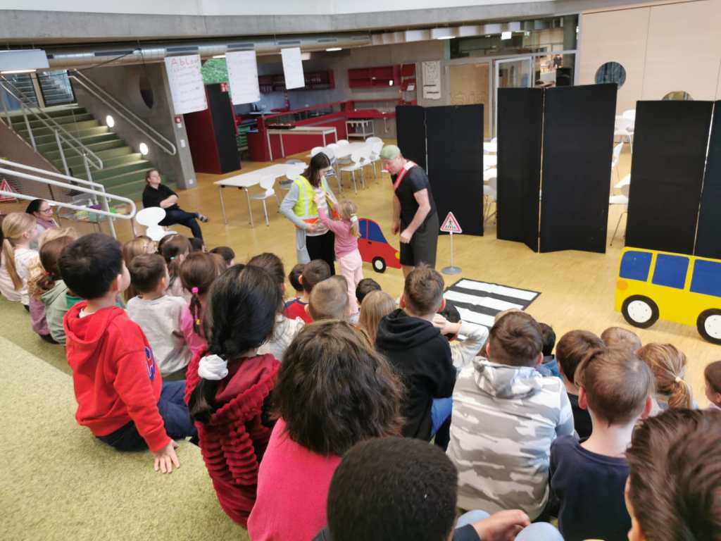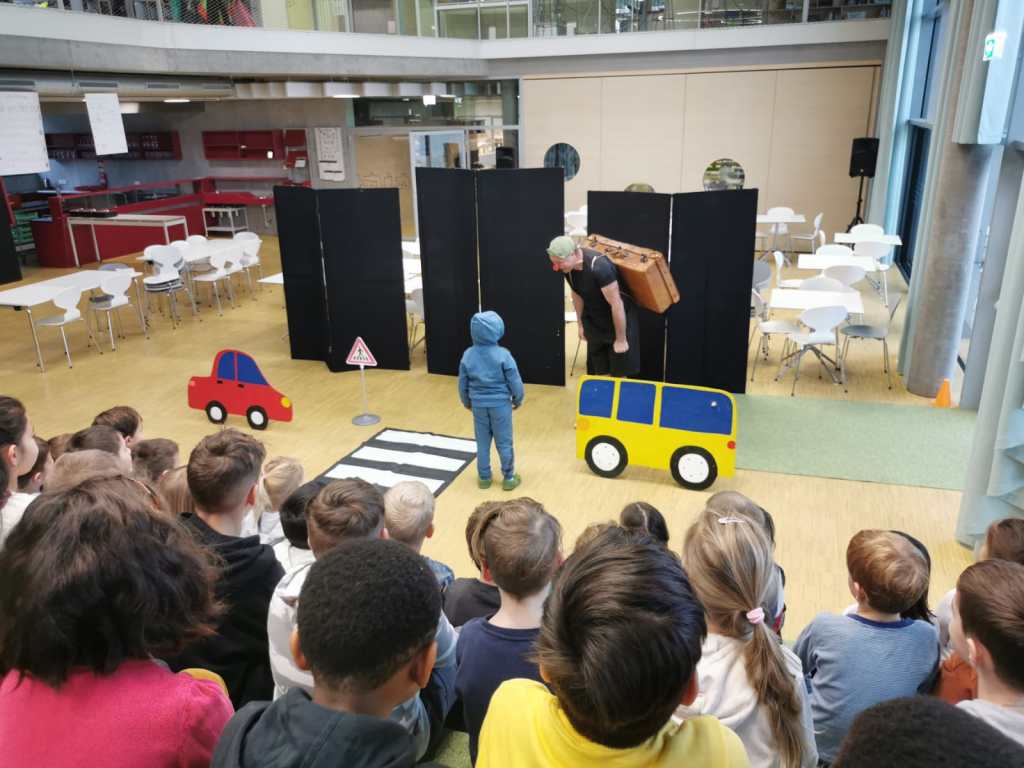 Auf spielerische Art und Weise trägt das wertvolle Schauspiel dazu bei, Gefahren auf der Straße zu erkennen und richtiges Verhalten einzuüben. Mit Schwung, Energie und viel Spaß brachte er den Kindern und sogar den Lehrerinnen bei, wie man richtig über die Straße geht. Danke Thiemo für deinen immer so erfrischenden Einsatz.