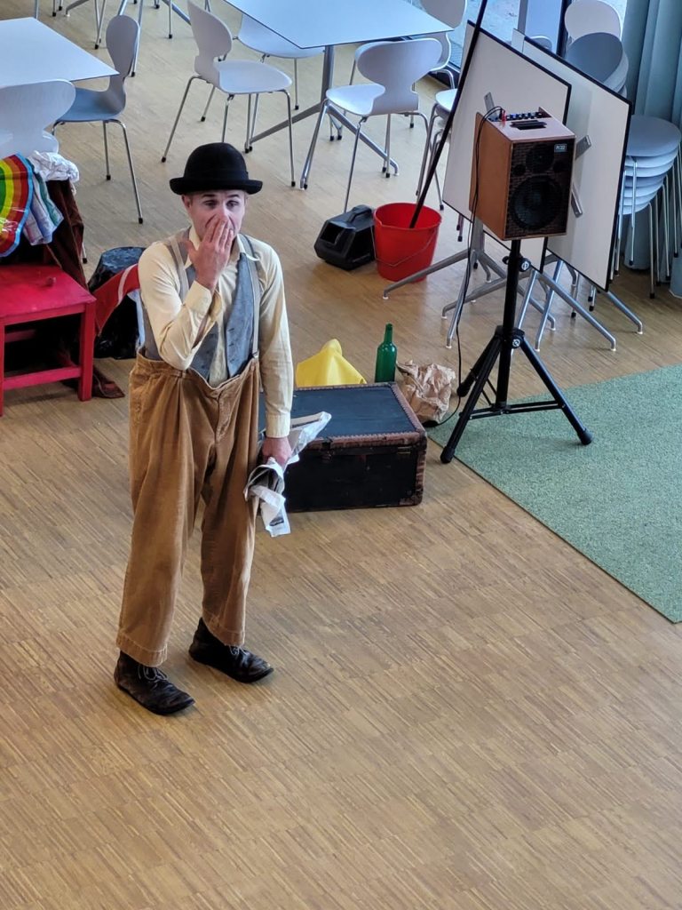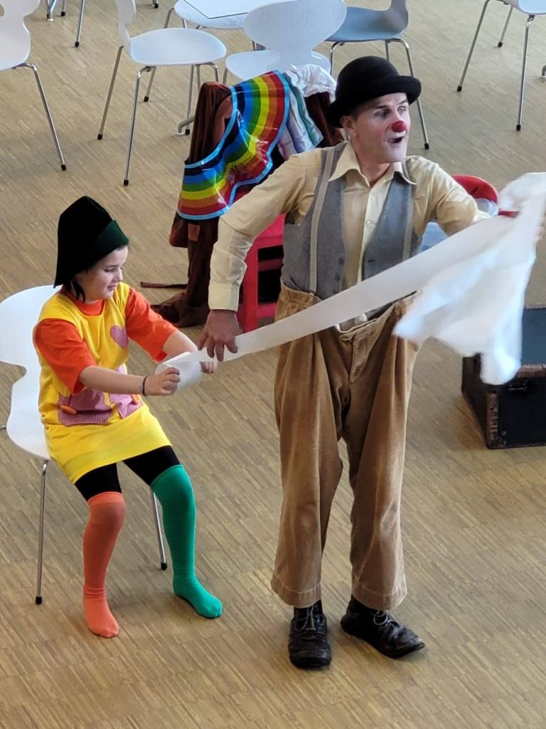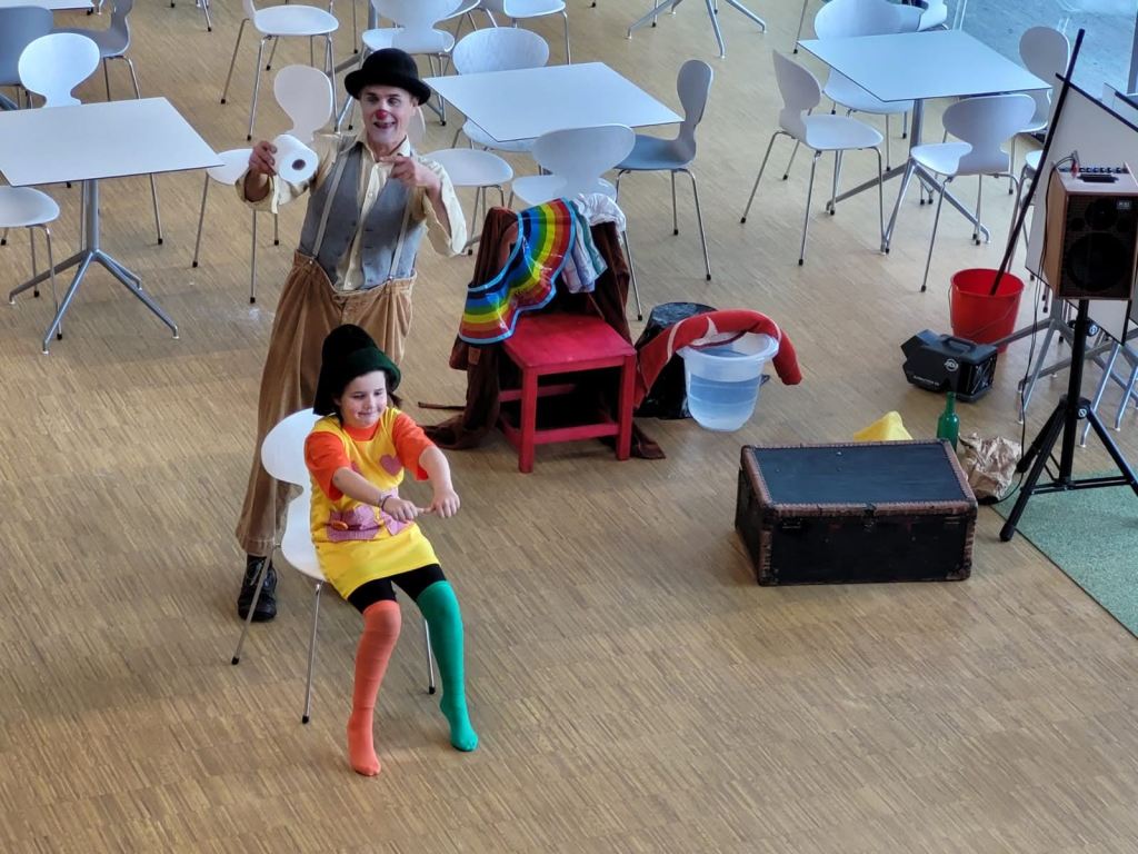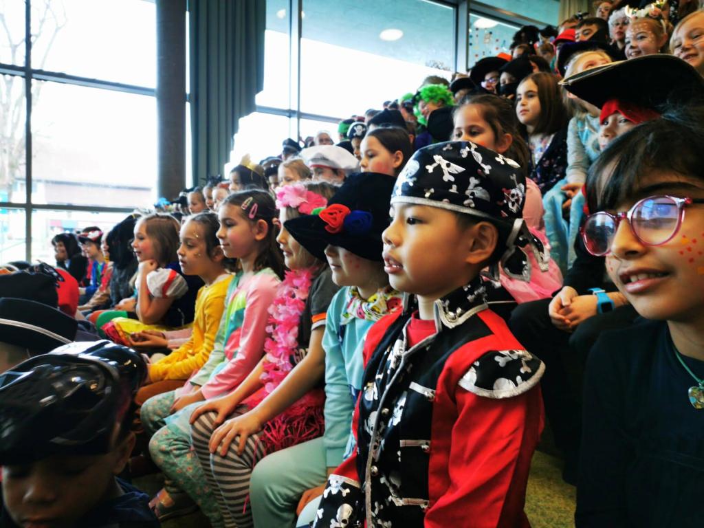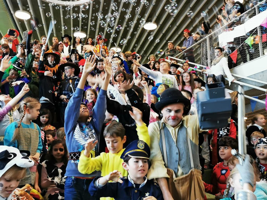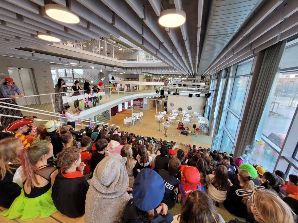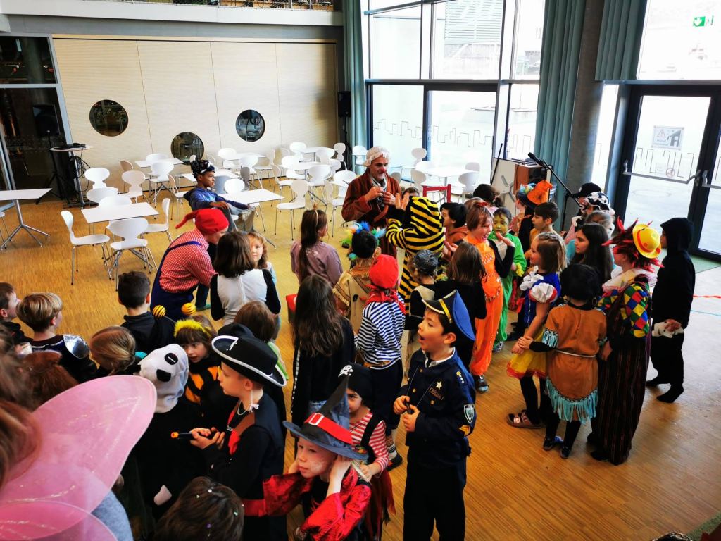Am Rosenmontag, den ersten Tag nach den Semesterferien, durften die Schülerinnen und Schüler maskiert in die Schule kommen. Ein buntes Programm in den Lernquartieren erwartete die Kinder. Ein leckerer Krapfen durfte dabei natürlich nicht fehlen. Das absolute Highlight für alle war aber der Besuch von Clown Pompo. Seine Show hat alle begeistert!