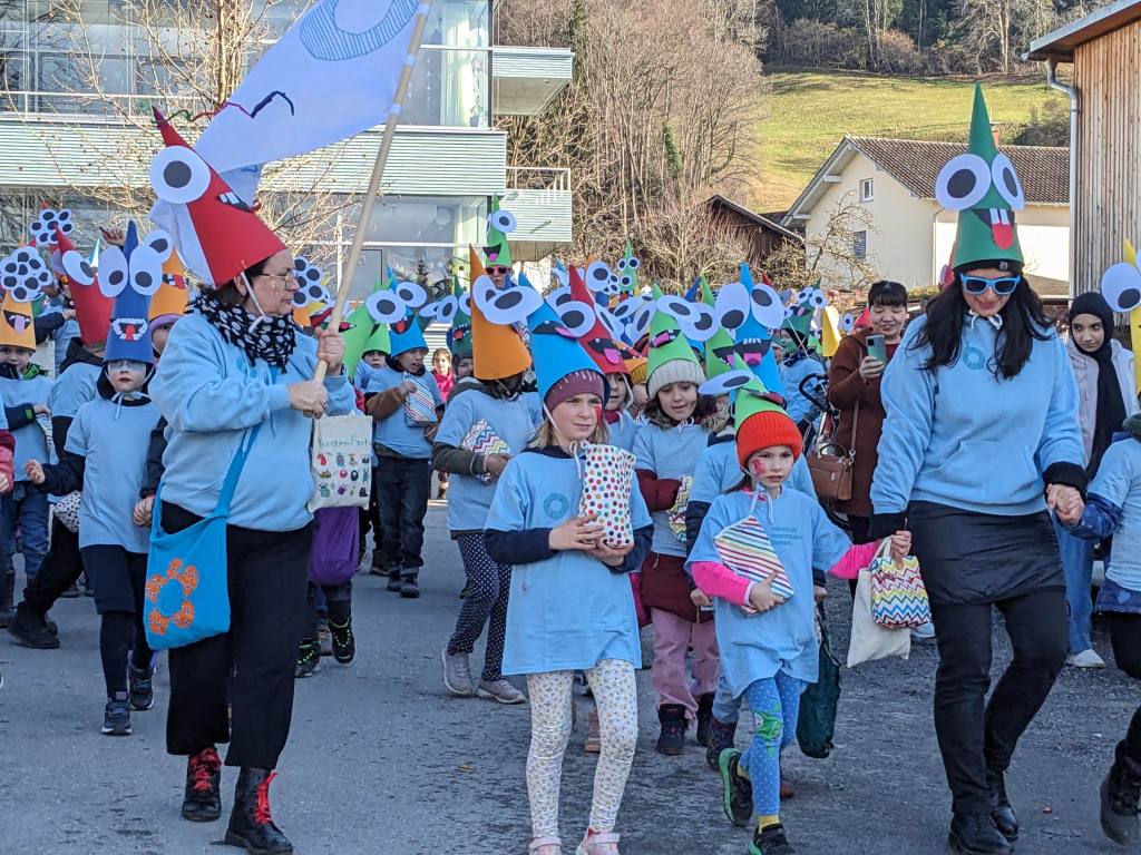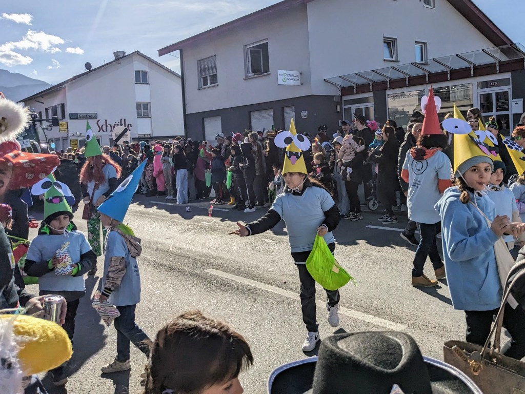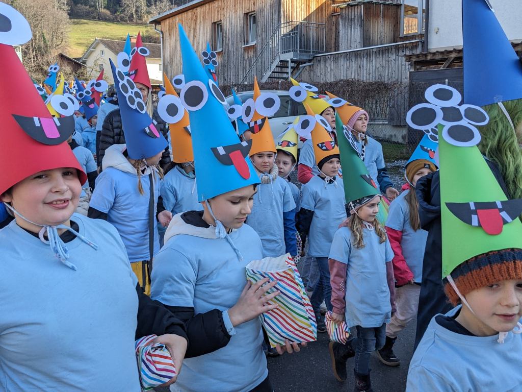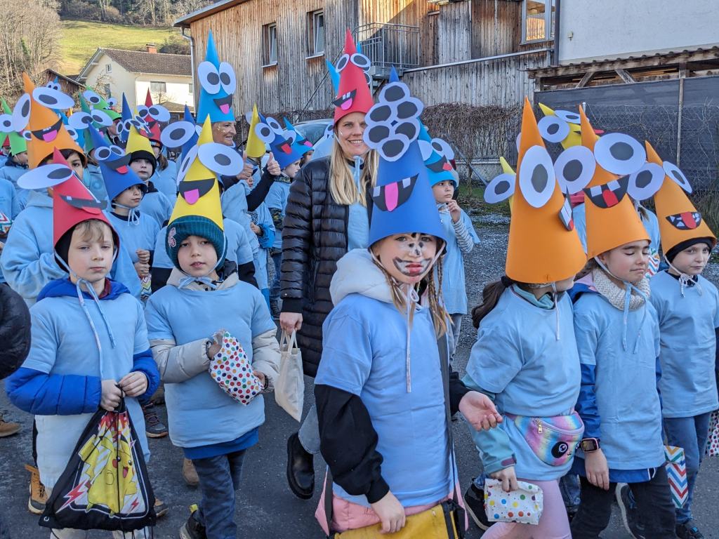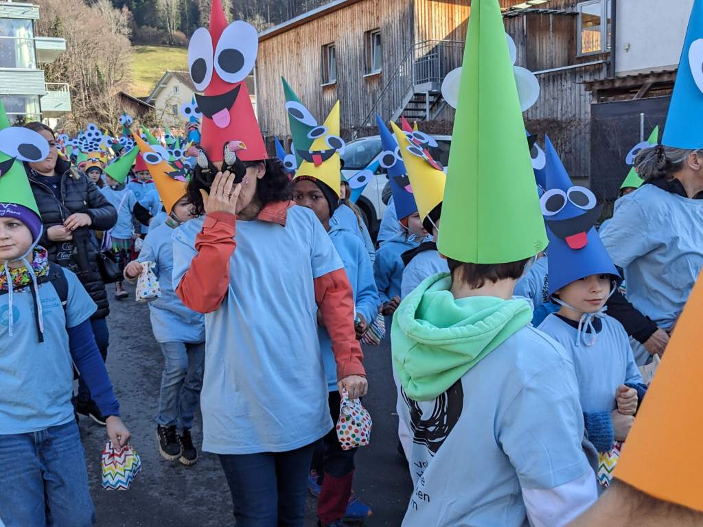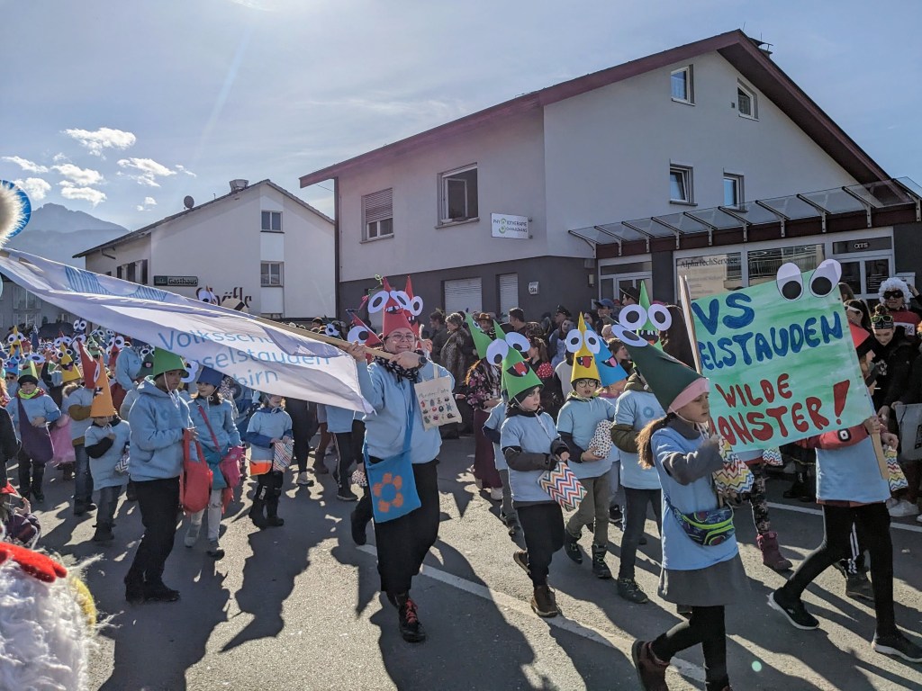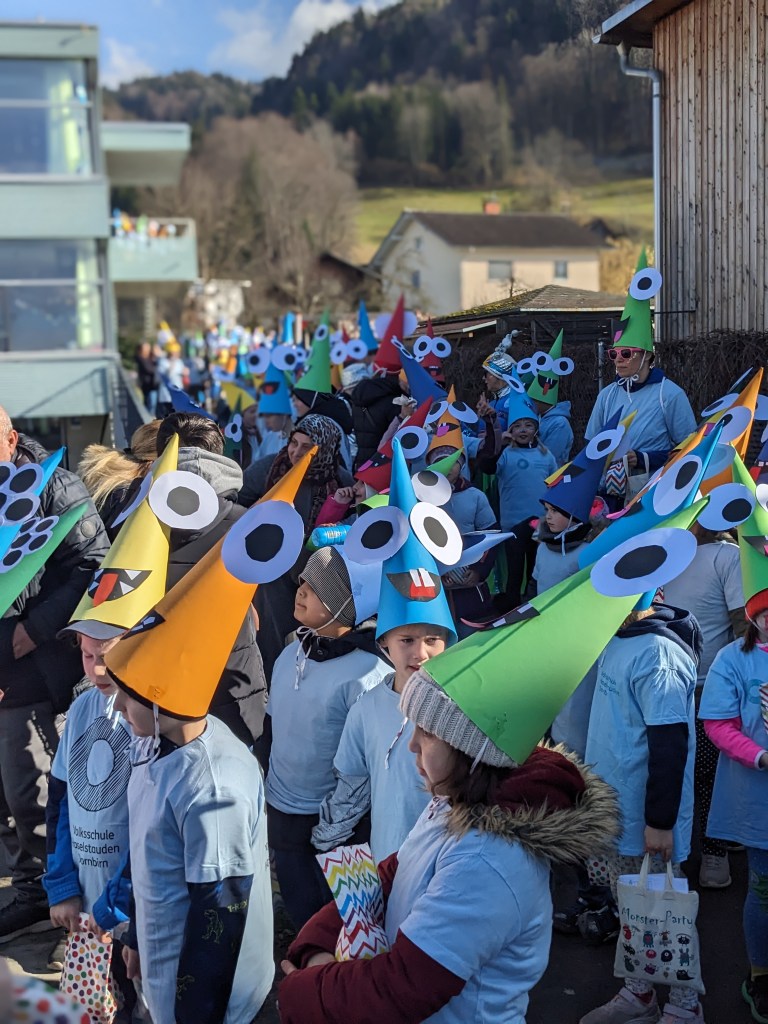 Von der Schule aus ging es dann direkt zur Aufstellung. Als Nummer 2 lief die Volksschule, als größte Gruppe des traditionellen Schottar-Umzugs. Die Kinder, Lehrpersonen und Eltern hatten sehr viel Spaß, tanzten zur Musik den Monstertanz und verteilten Bonbons.