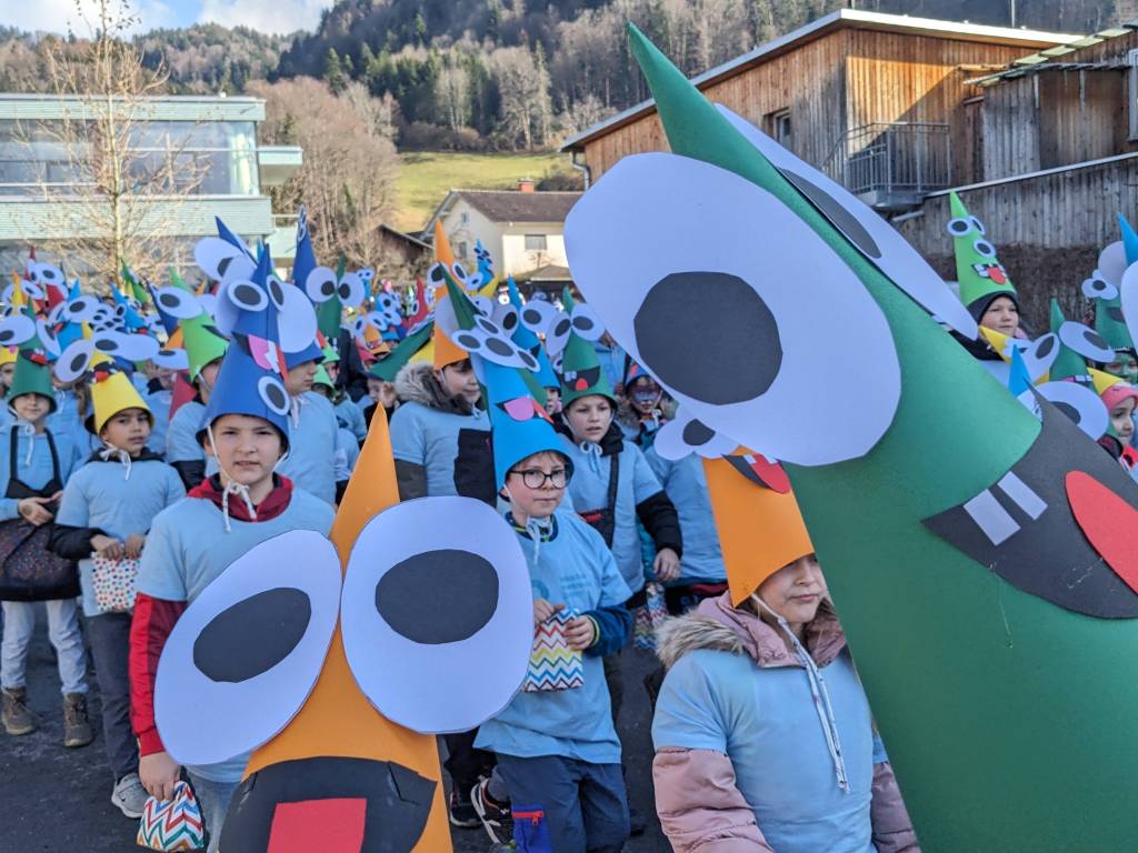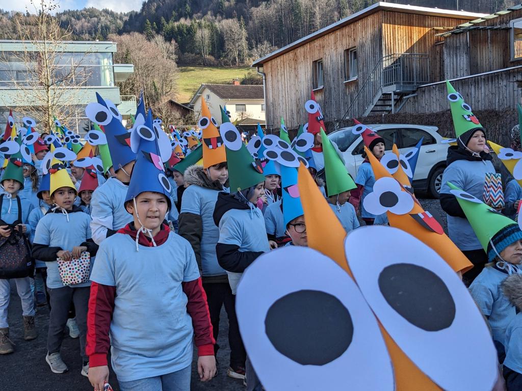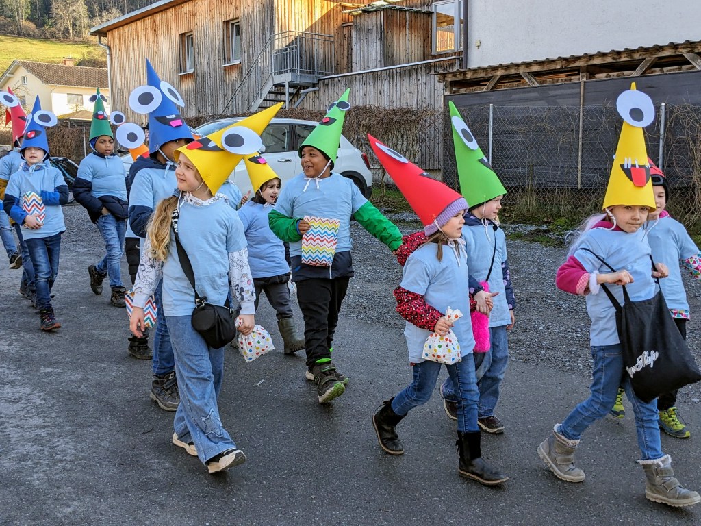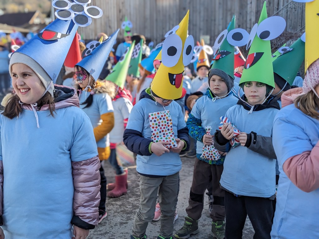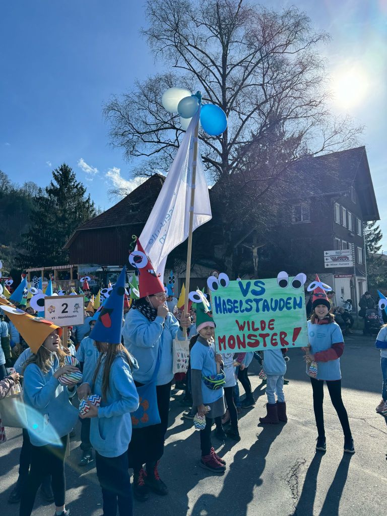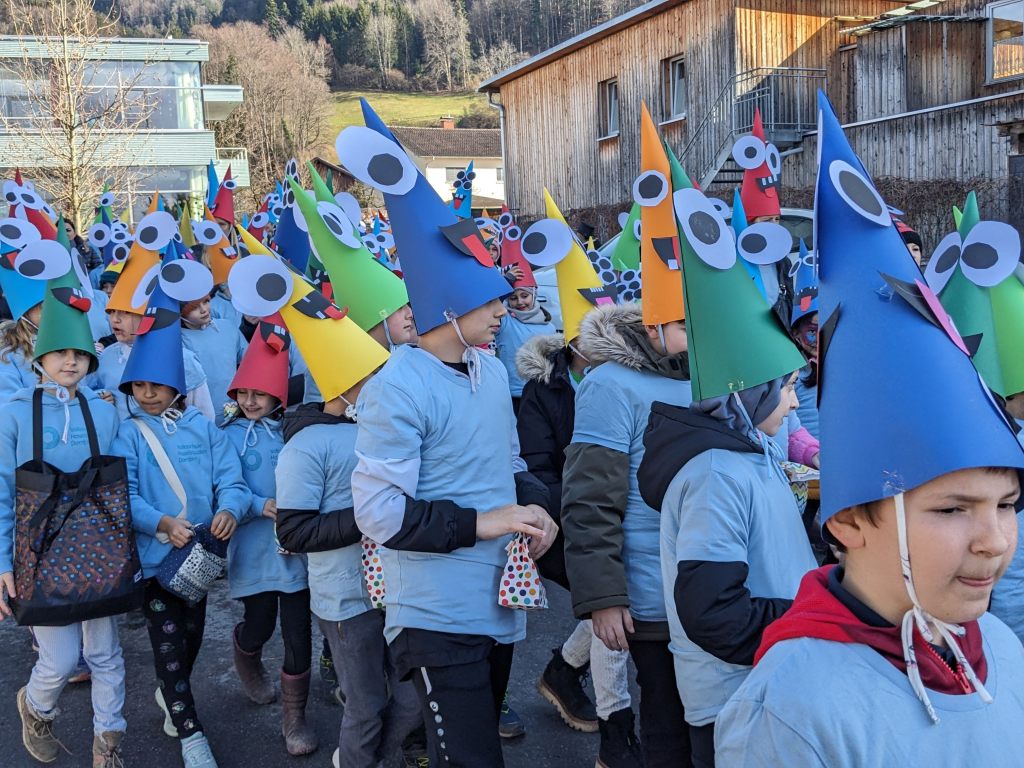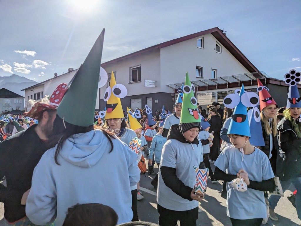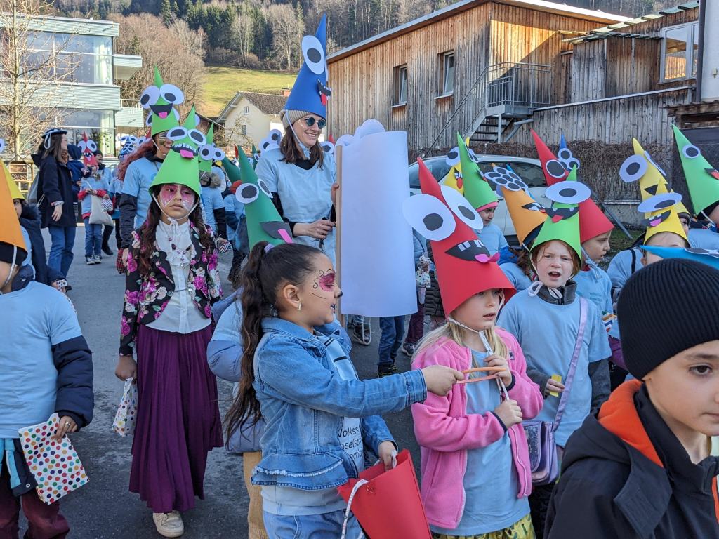 Von der Schule aus ging es dann direkt zur Aufstellung. Als Nummer 2 lief die Volksschule, als größte Gruppe des traditionellen Schottar-Umzugs. Die Kinder, Lehrpersonen und Eltern hatten sehr viel Spaß, tanzten zur Musik den Monstertanz und verteilten Bonbons.