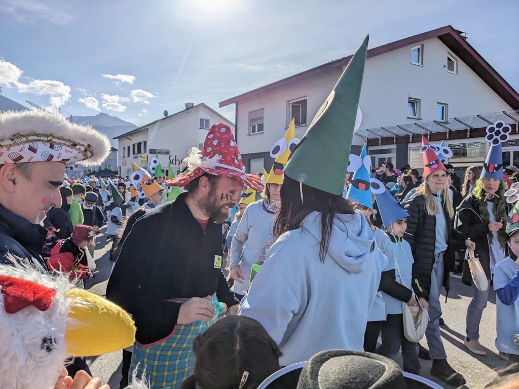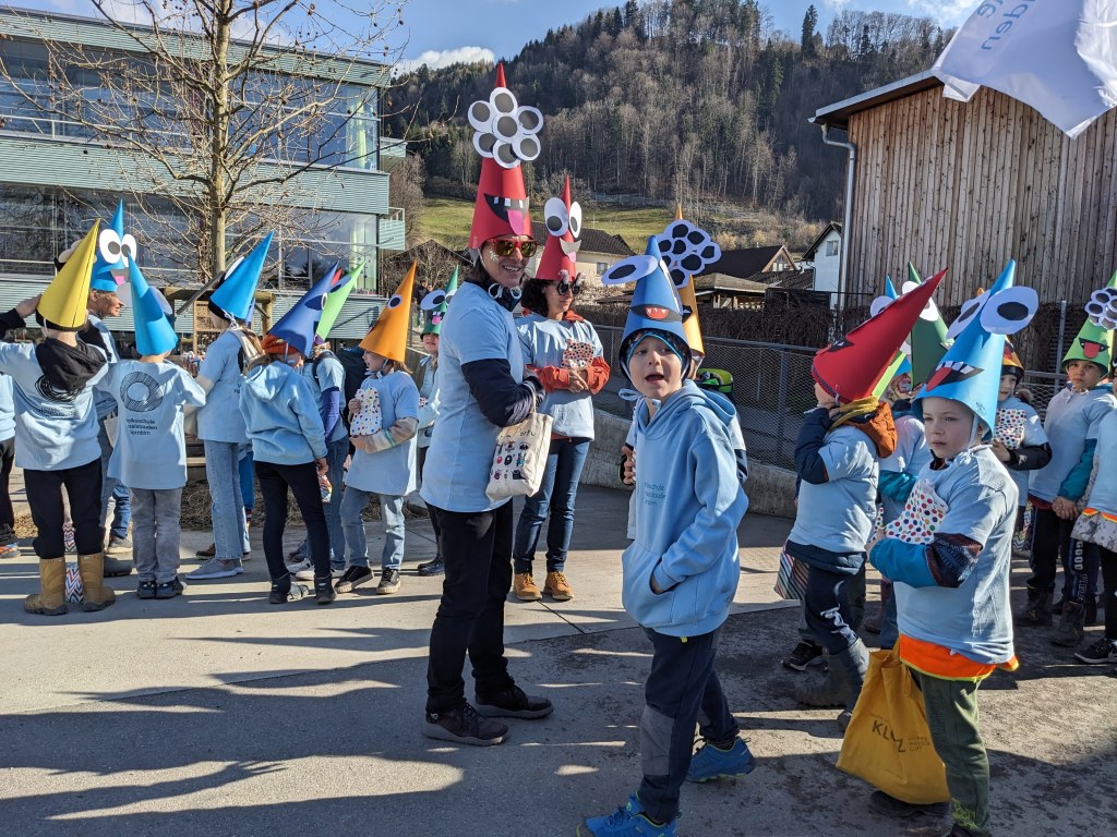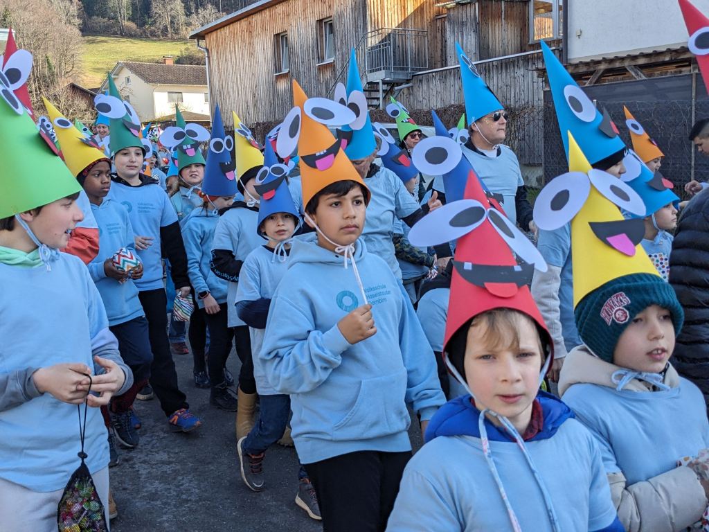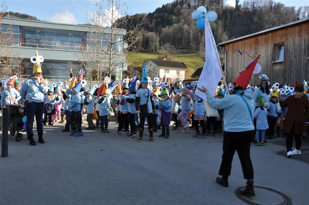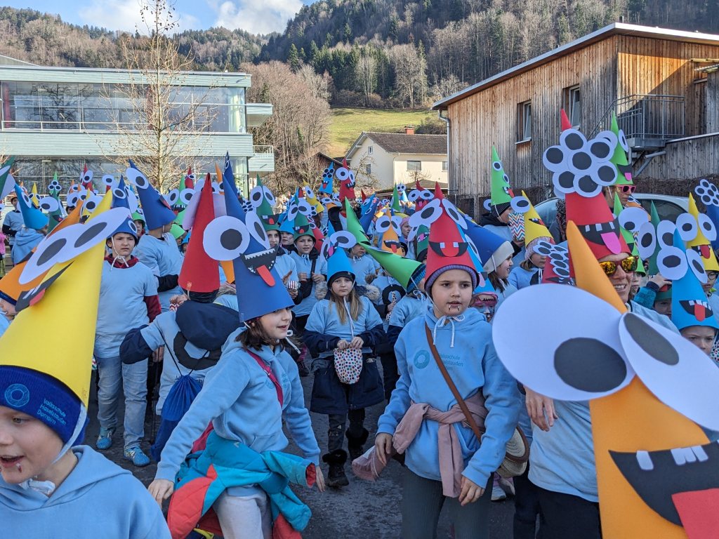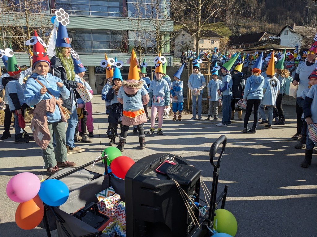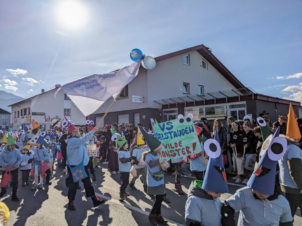 Von der Schule aus ging es dann direkt zur Aufstellung. Als Nummer 2 lief die Volksschule, als größte Gruppe des traditionellen Schottar-Umzugs. Die Kinder, Lehrpersonen und Eltern hatten sehr viel Spaß, tanzten zur Musik den Monstertanz und verteilten Bonbons.