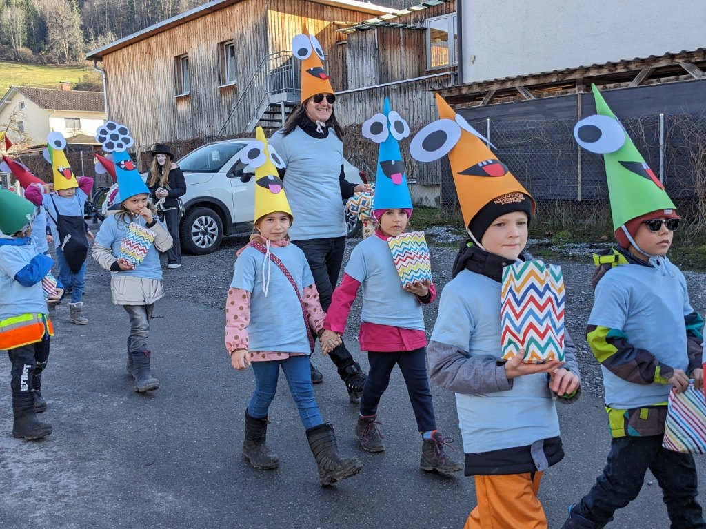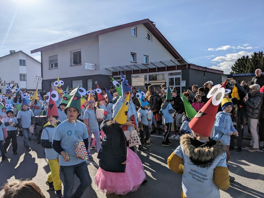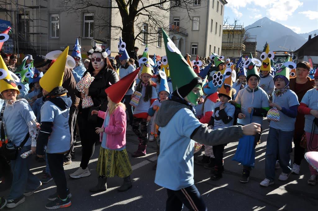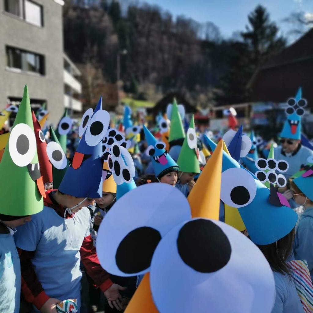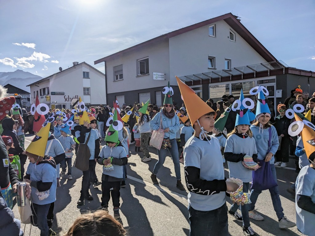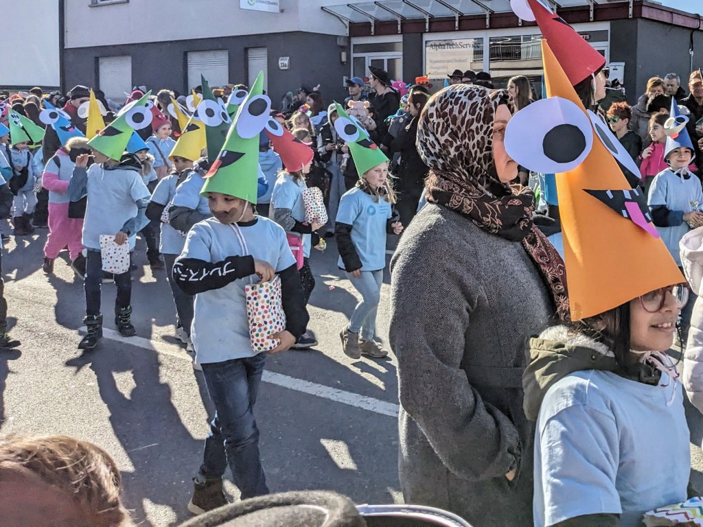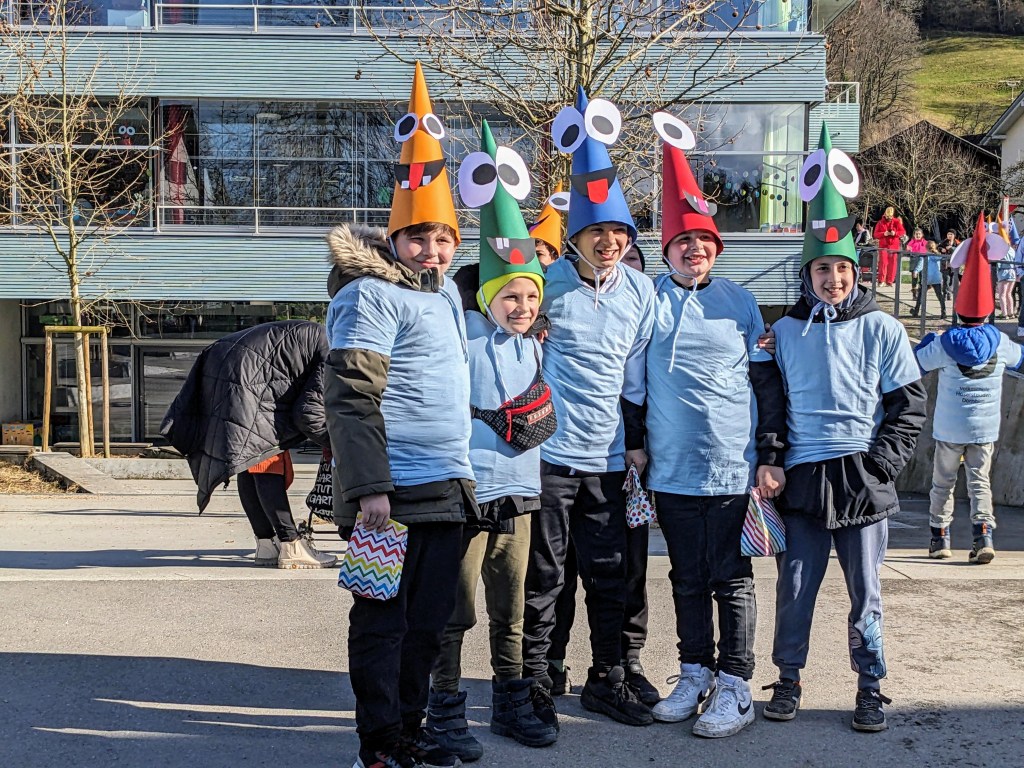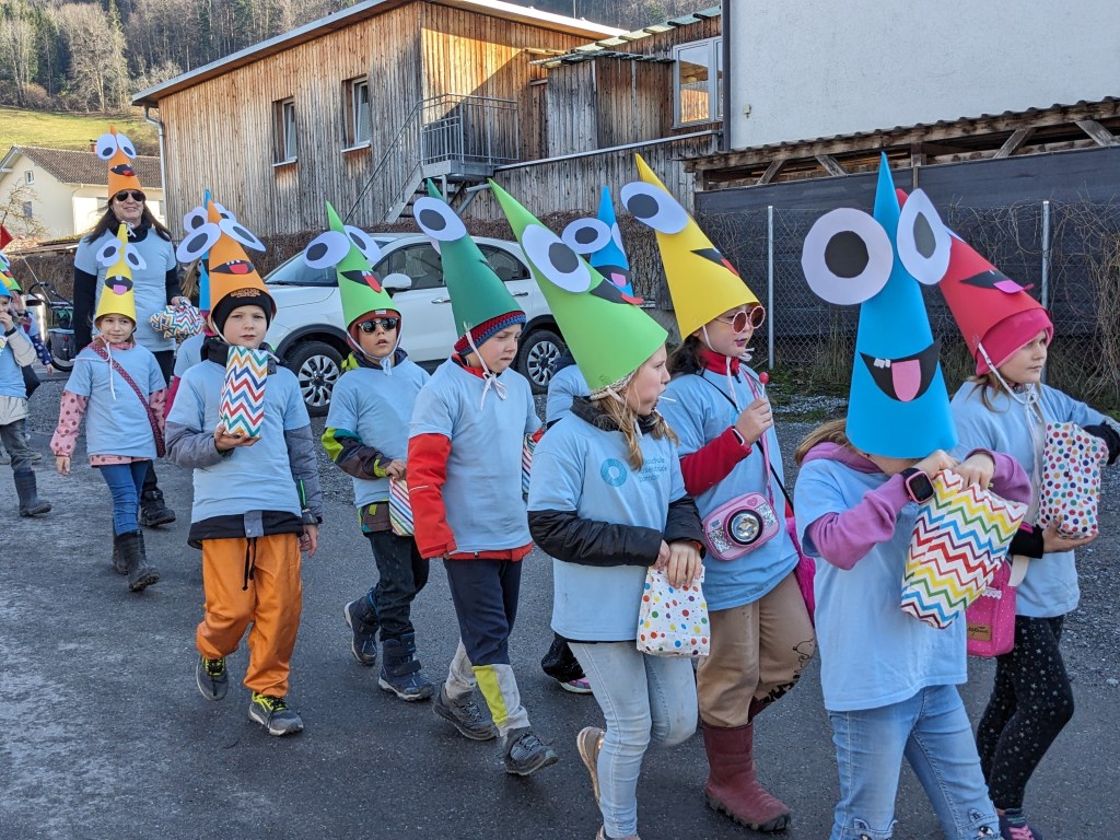 Von der Schule aus ging es dann direkt zur Aufstellung. Als Nummer 2 lief die Volksschule, als größte Gruppe des traditionellen Schottar-Umzugs. Die Kinder, Lehrpersonen und Eltern hatten sehr viel Spaß, tanzten zur Musik den Monstertanz und verteilten Bonbons.