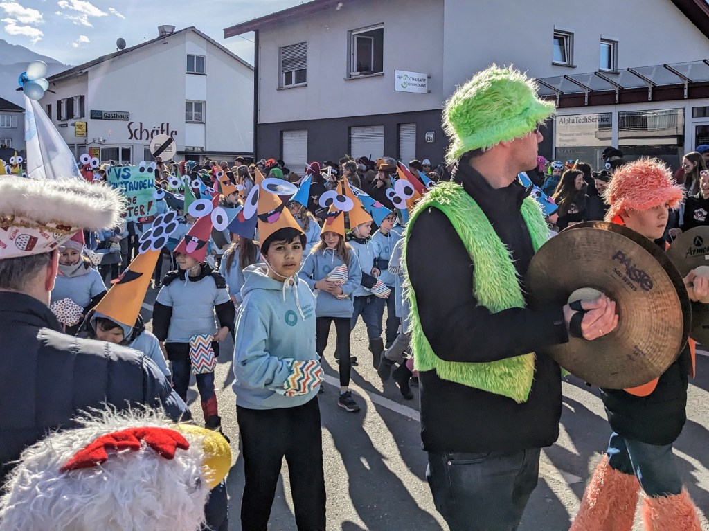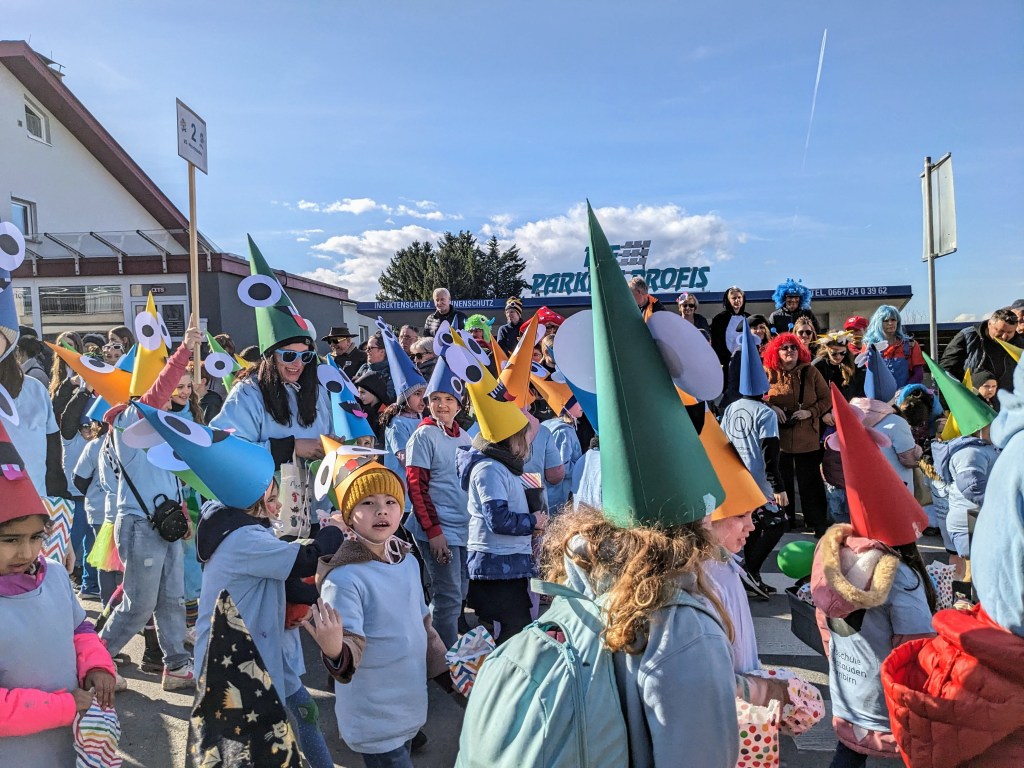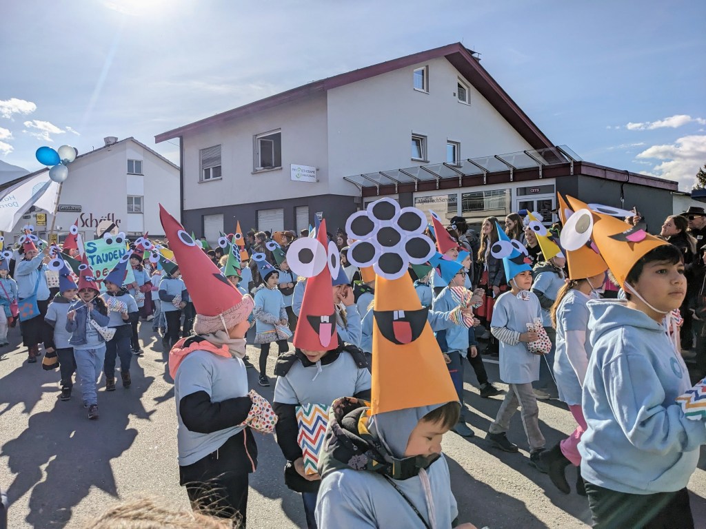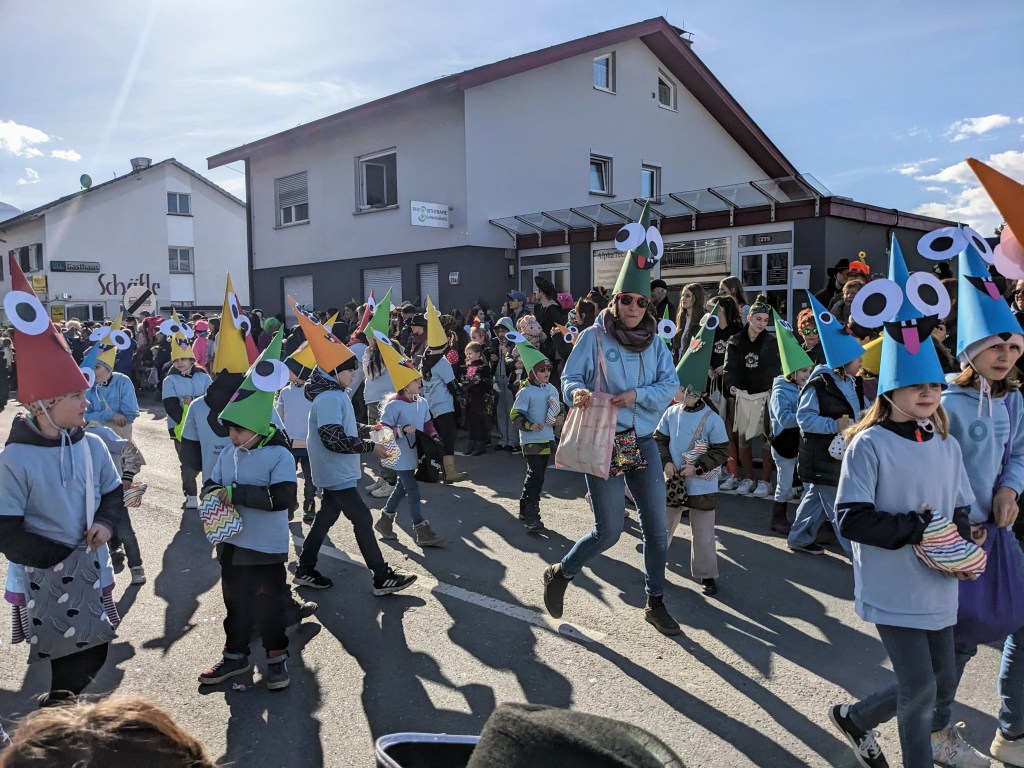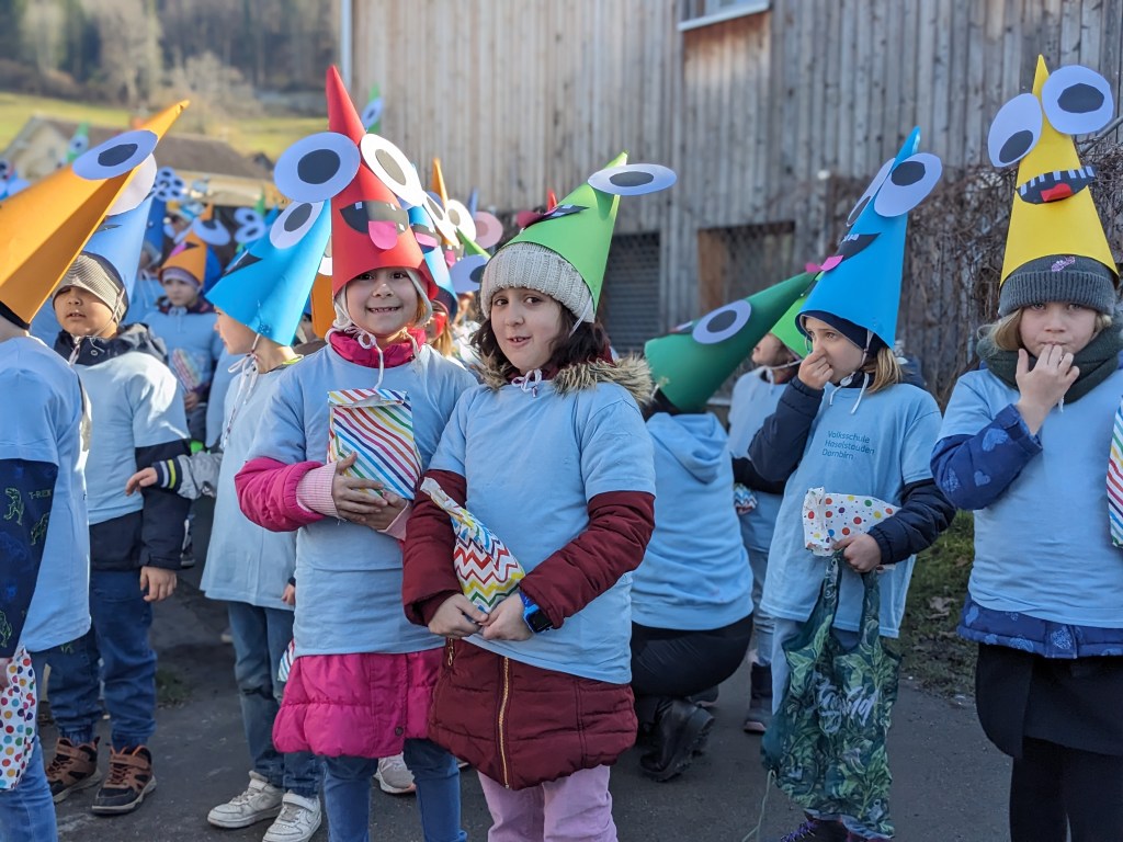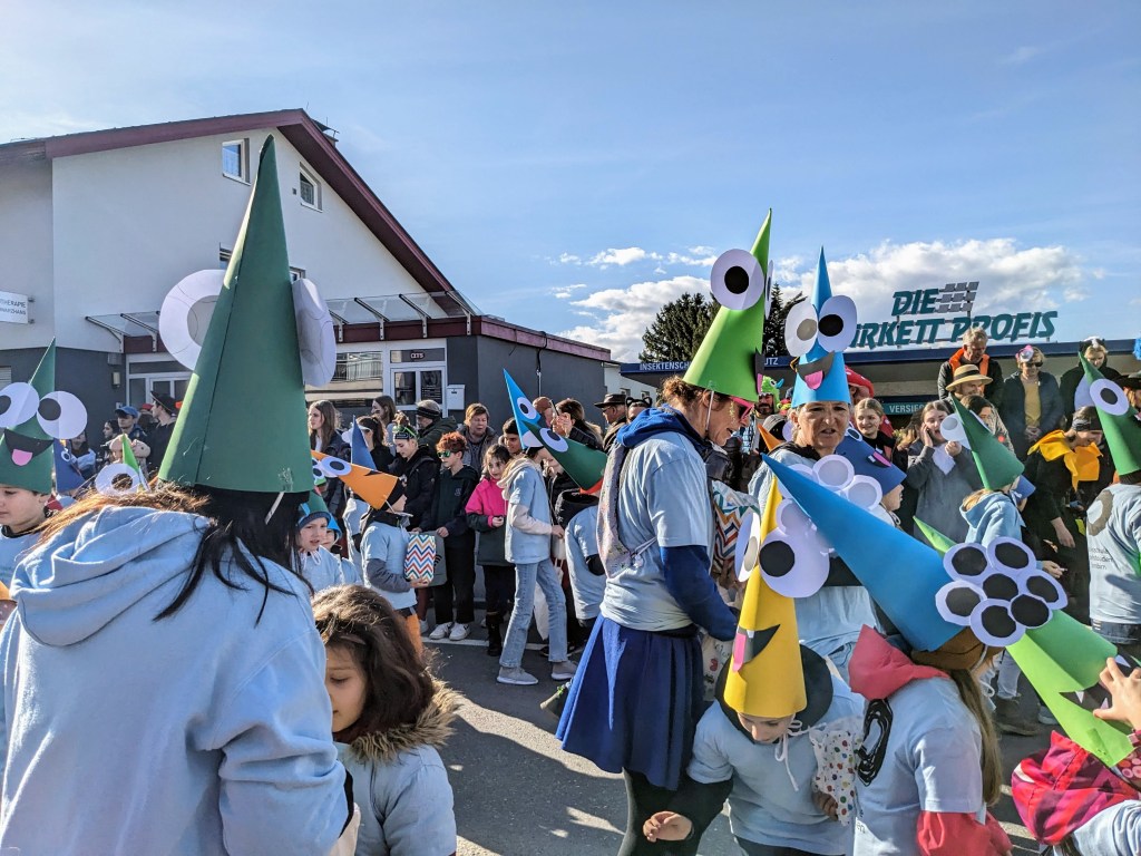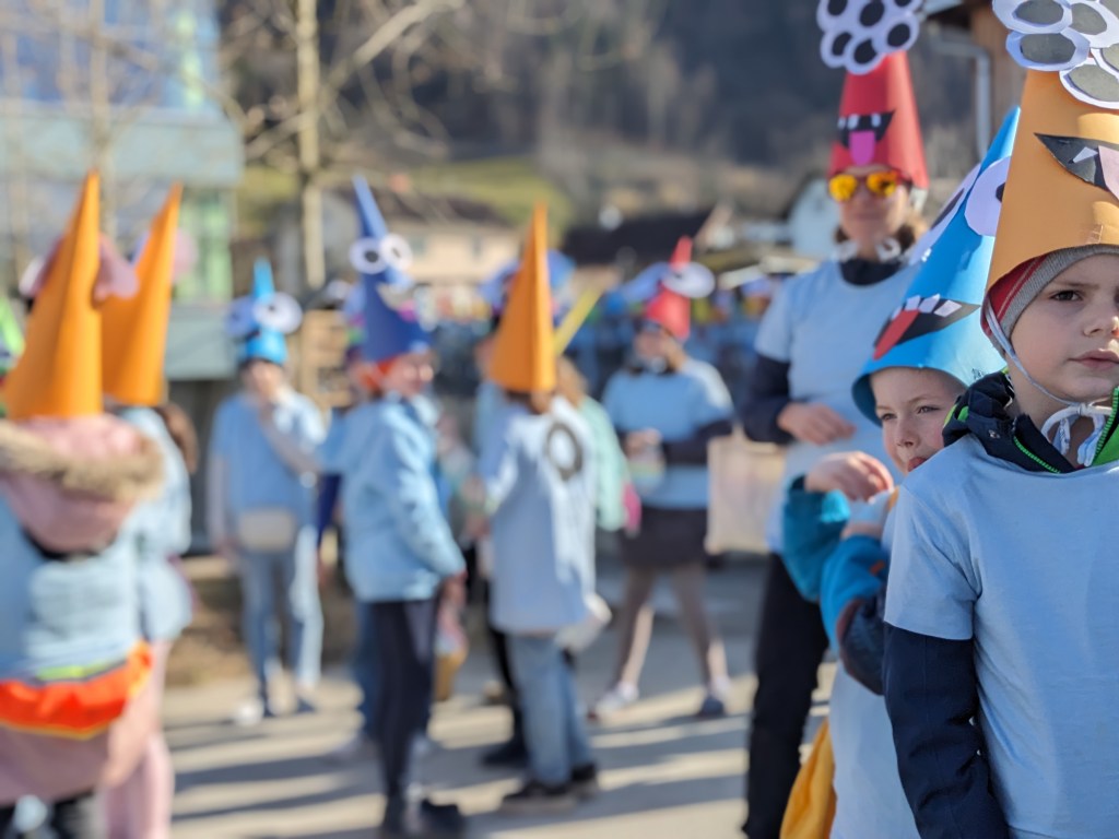 Von der Schule aus ging es dann direkt zur Aufstellung. Als Nummer 2 lief die Volksschule, als größte Gruppe des traditionellen Schottar-Umzugs. Die Kinder, Lehrpersonen und Eltern hatten sehr viel Spaß, tanzten zur Musik den Monstertanz und verteilten Bonbons.