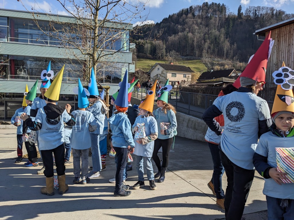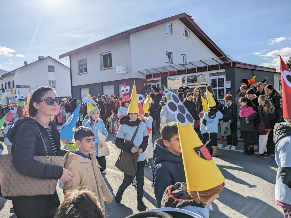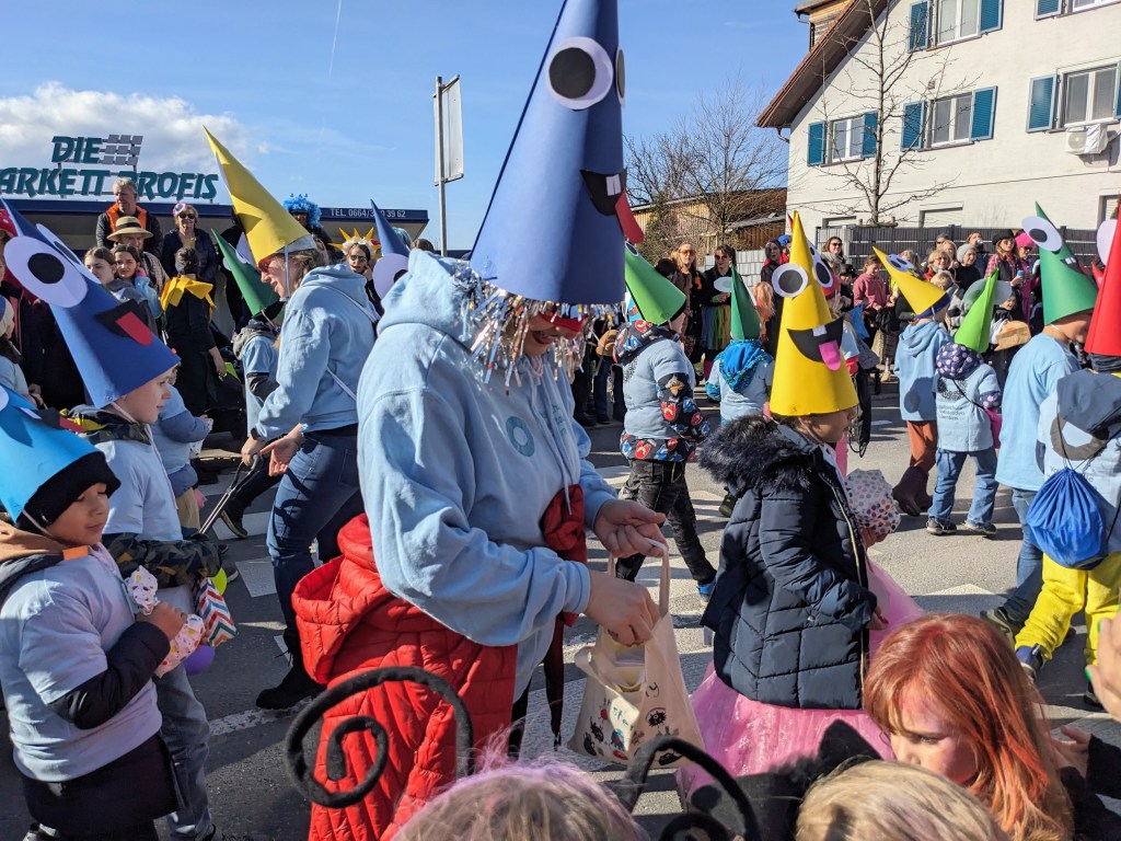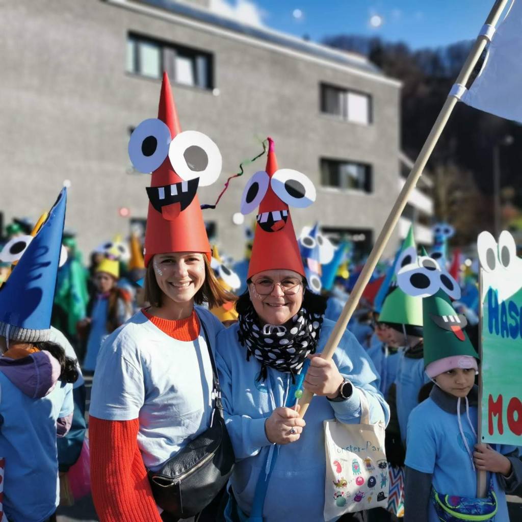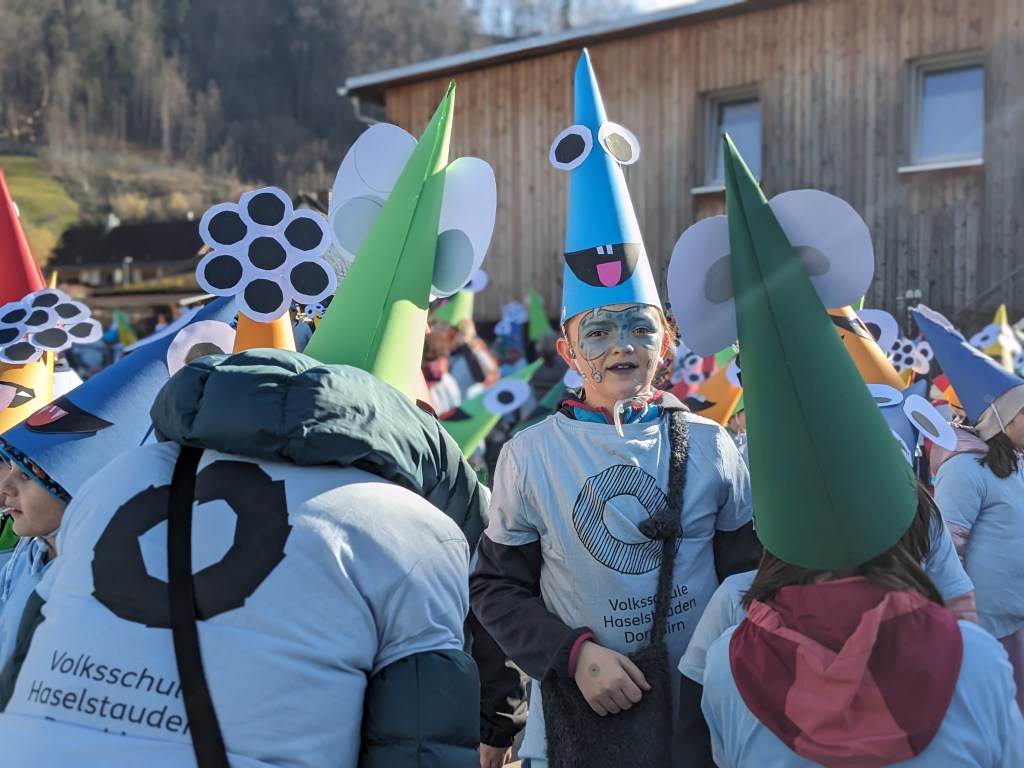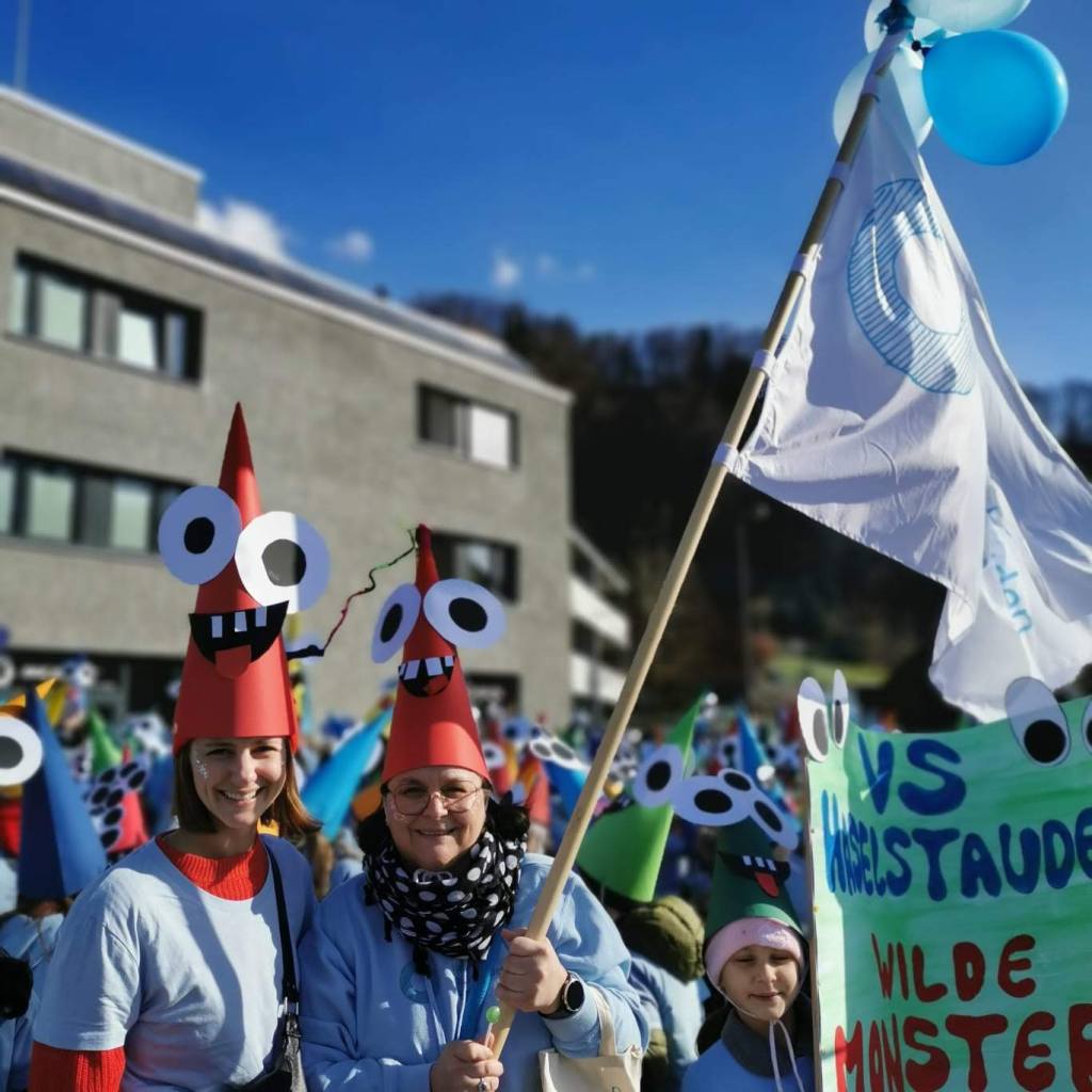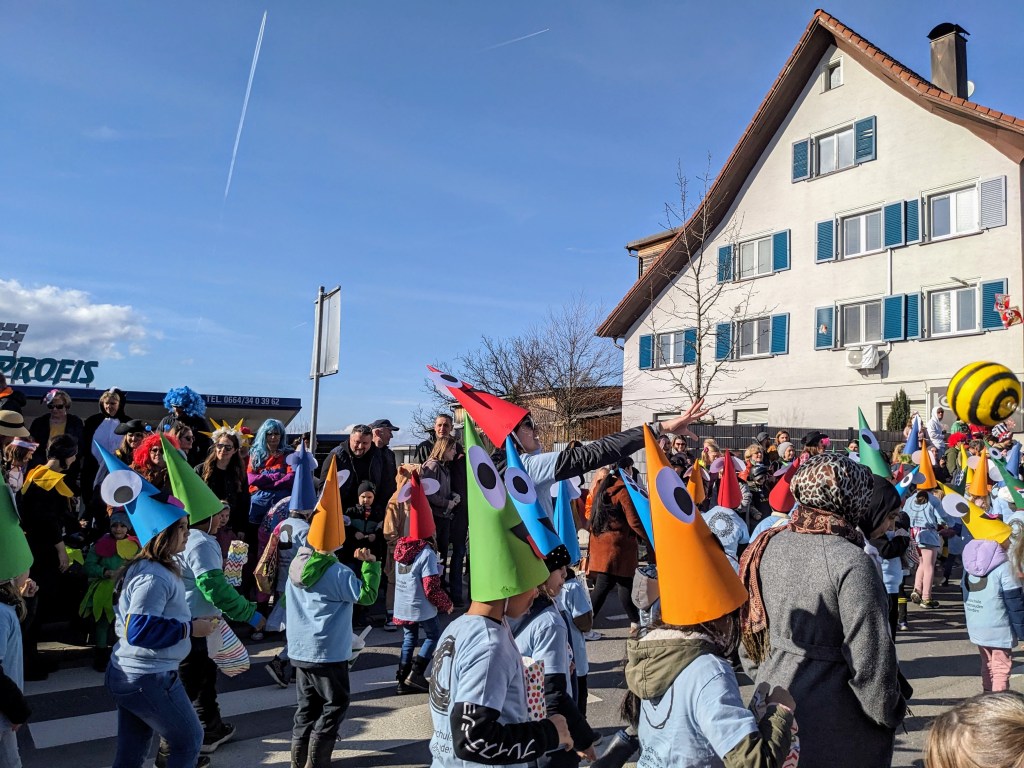 Von der Schule aus ging es dann direkt zur Aufstellung. Als Nummer 2 lief die Volksschule, als größte Gruppe des traditionellen Schottar-Umzugs. Die Kinder, Lehrpersonen und Eltern hatten sehr viel Spaß, tanzten zur Musik den Monstertanz und verteilten Bonbons.