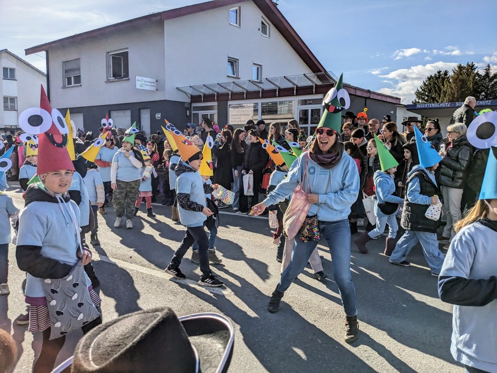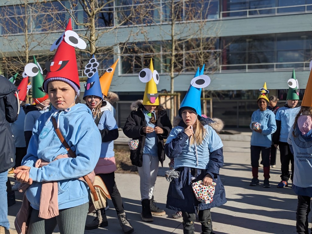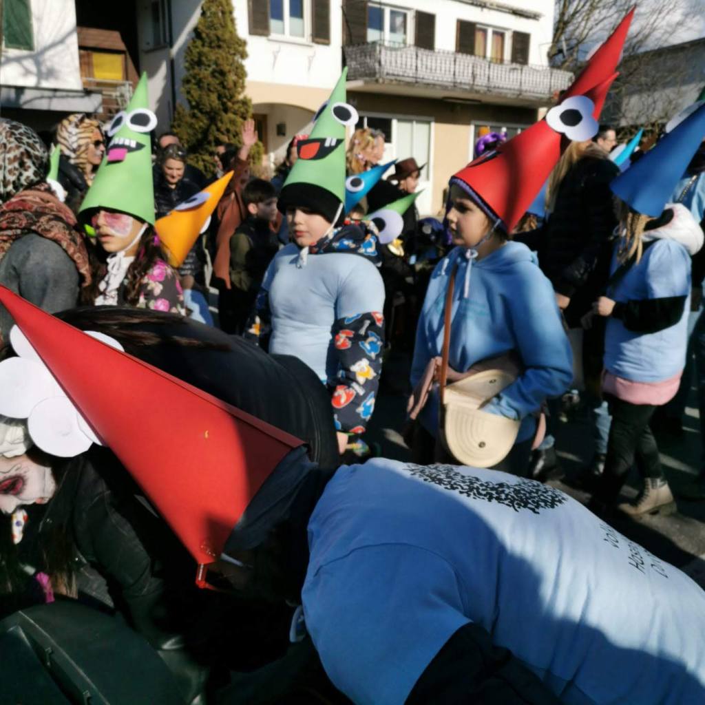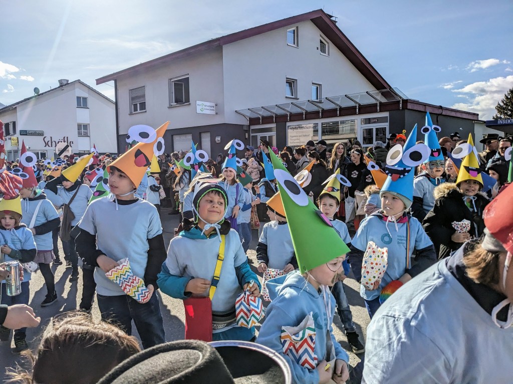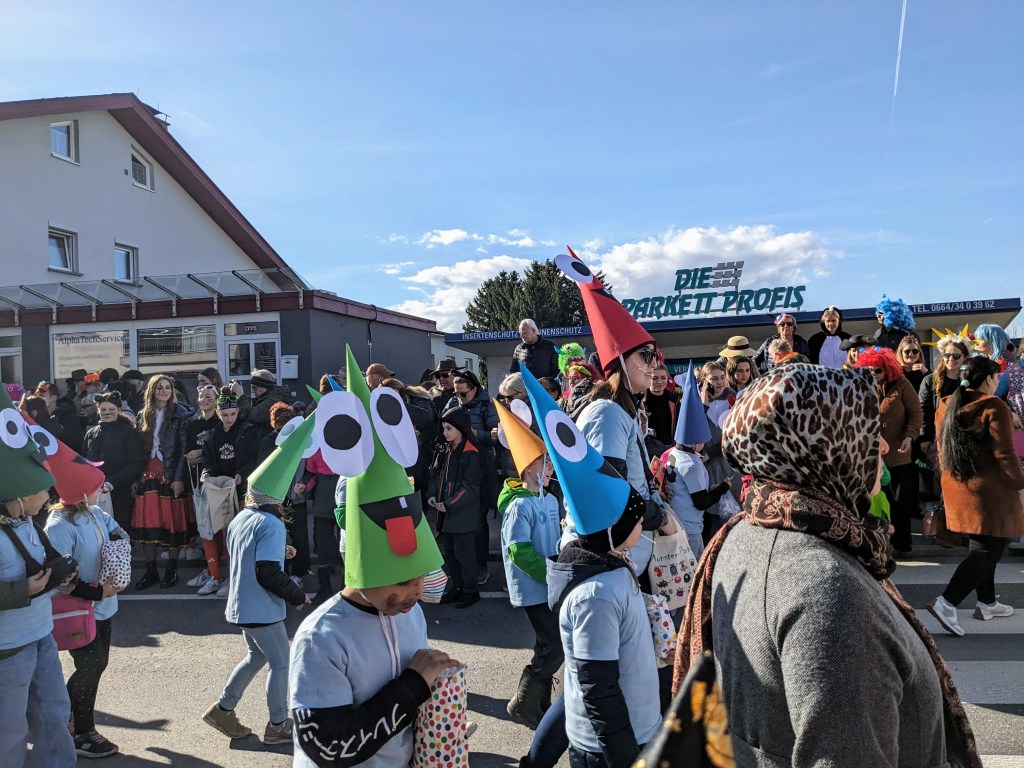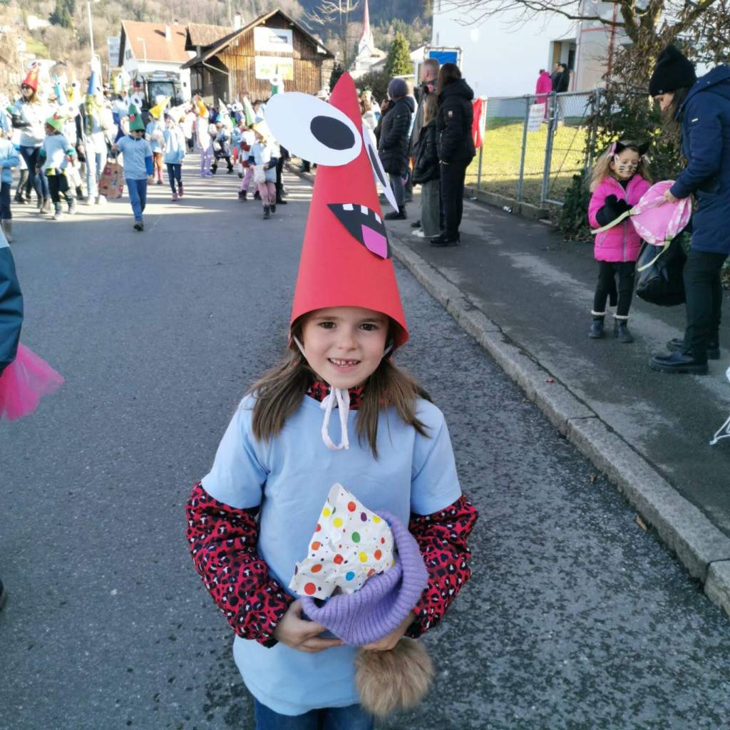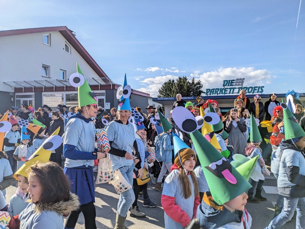 Von der Schule aus ging es dann direkt zur Aufstellung. Als Nummer 2 lief die Volksschule, als größte Gruppe des traditionellen Schottar-Umzugs. Die Kinder, Lehrpersonen und Eltern hatten sehr viel Spaß, tanzten zur Musik den Monstertanz und verteilten Bonbons.