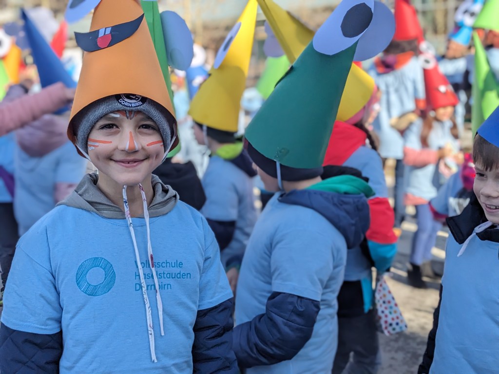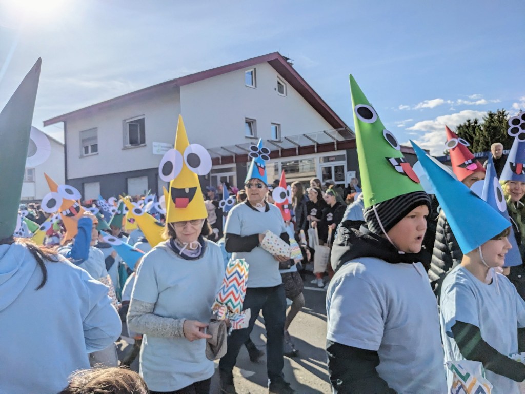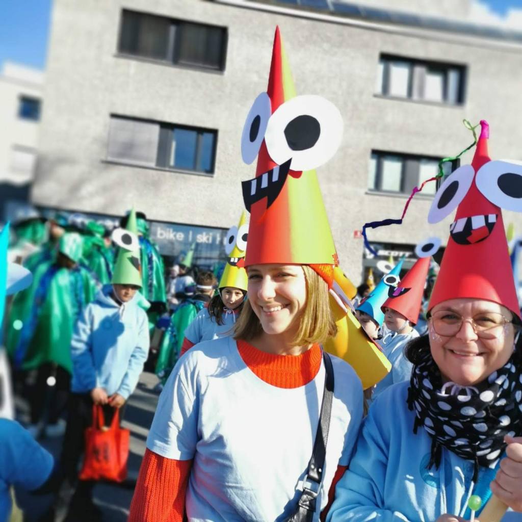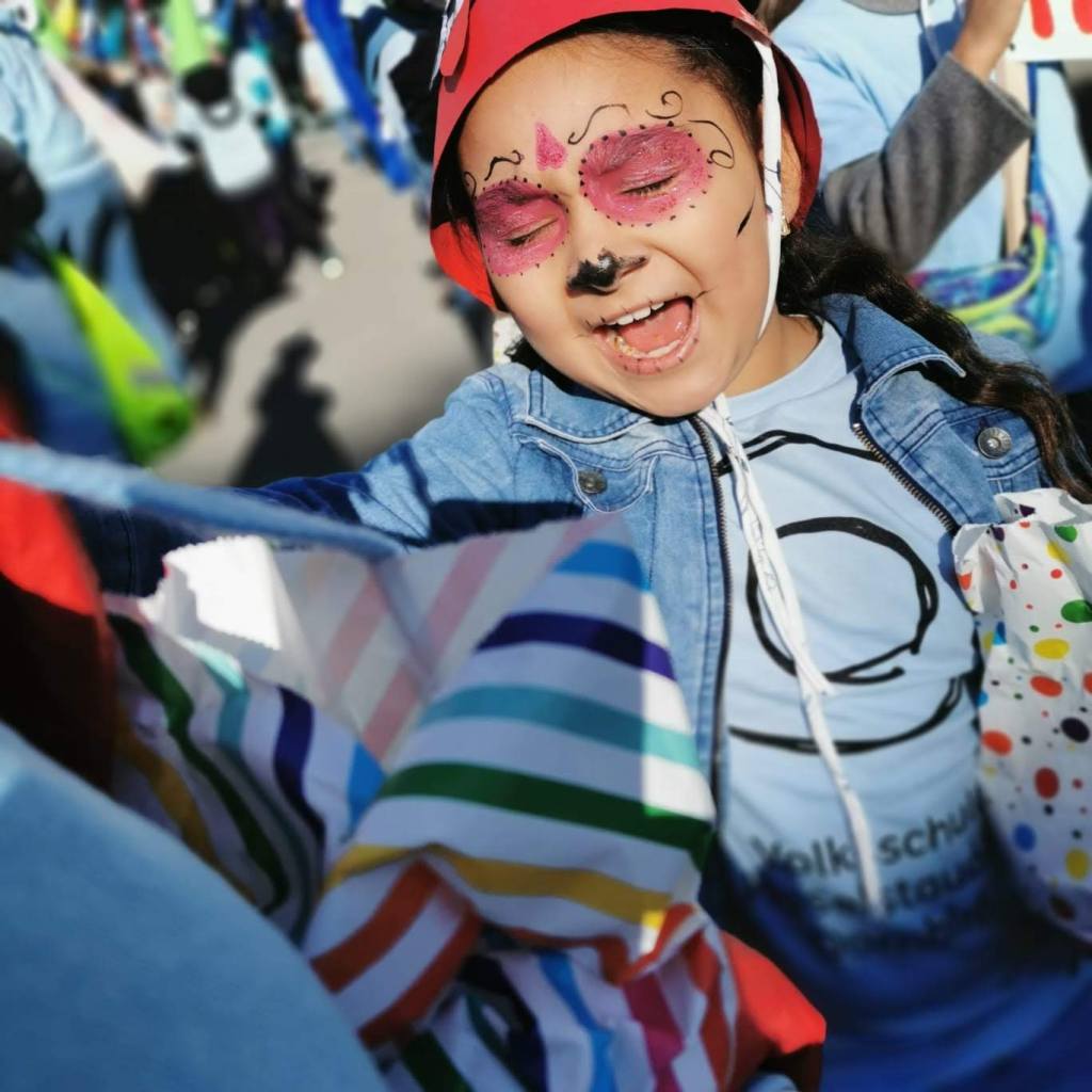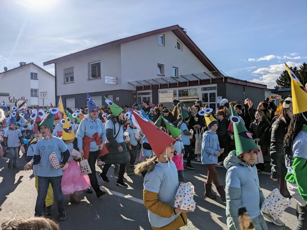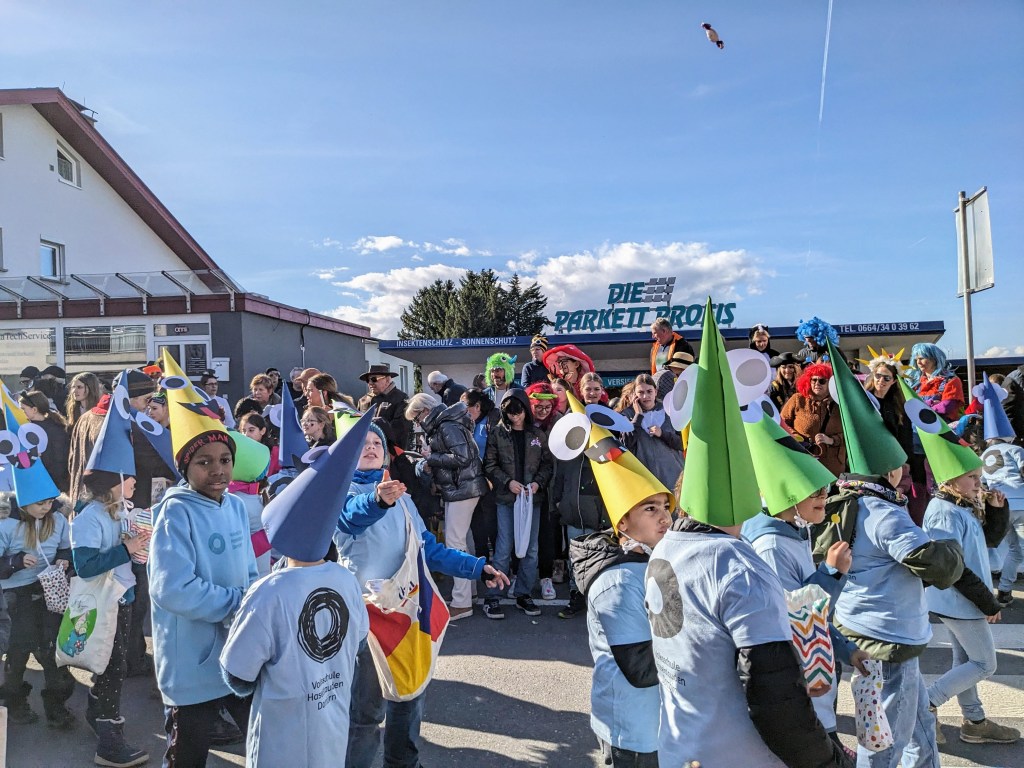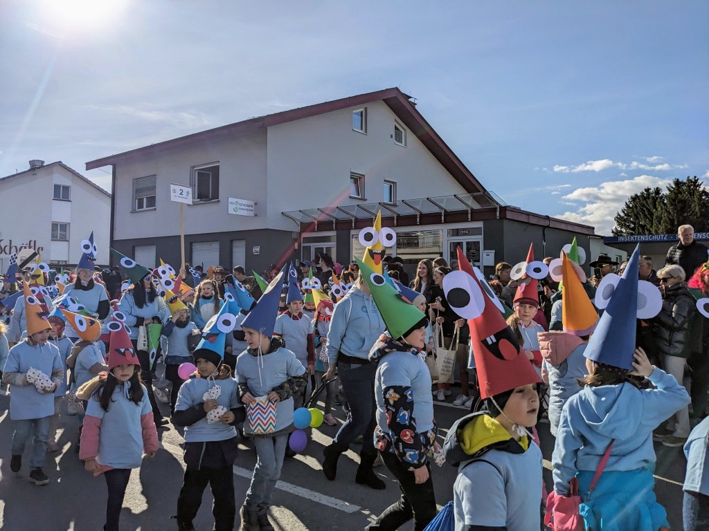 Von der Schule aus ging es dann direkt zur Aufstellung. Als Nummer 2 lief die Volksschule, als größte Gruppe des traditionellen Schottar-Umzugs. Die Kinder, Lehrpersonen und Eltern hatten sehr viel Spaß, tanzten zur Musik den Monstertanz und verteilten Bonbons.