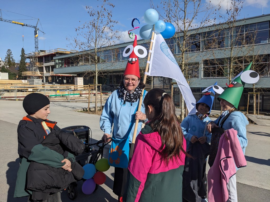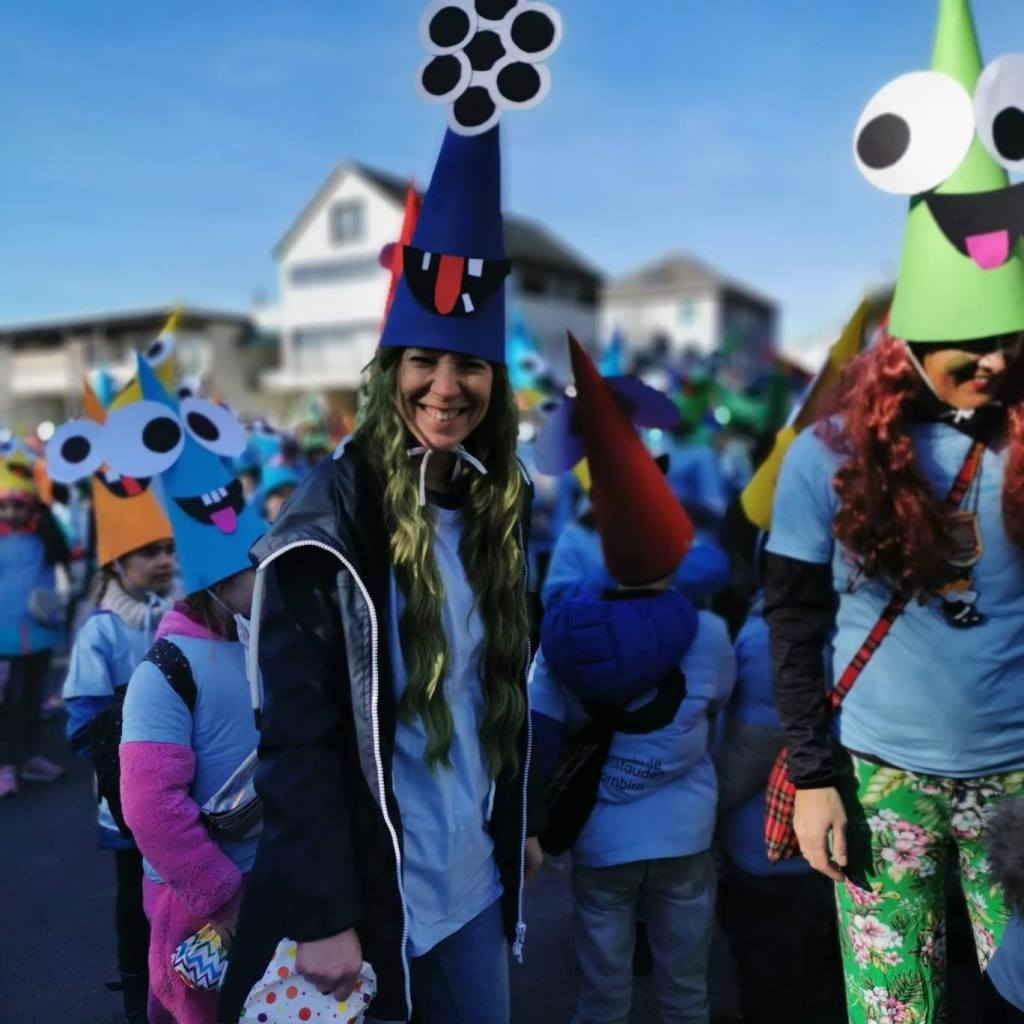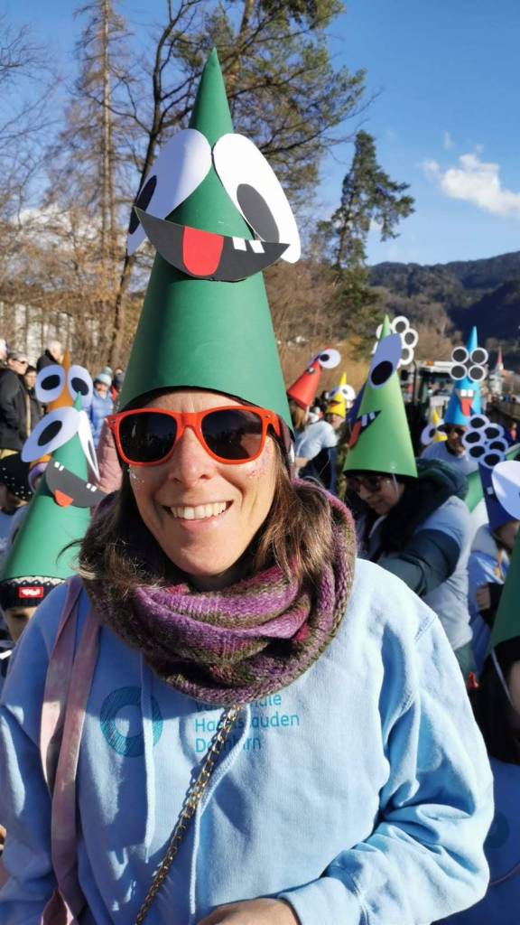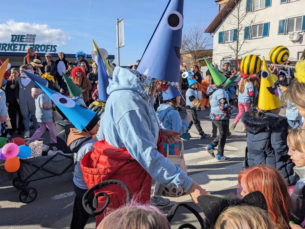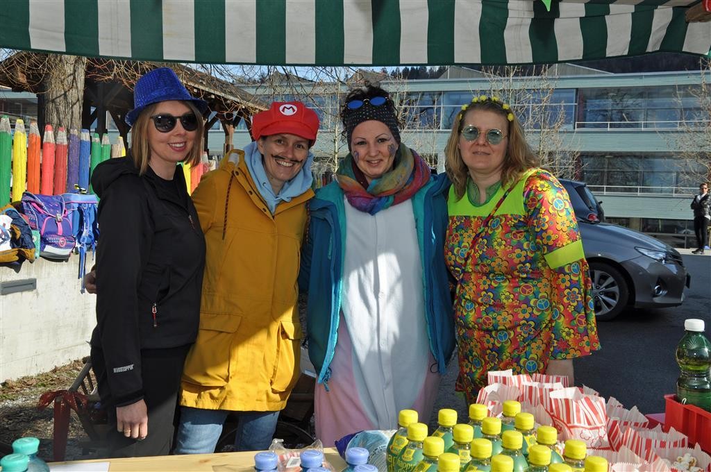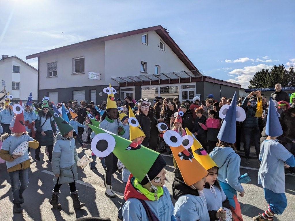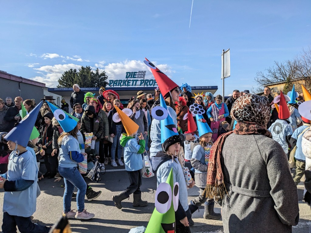 Von der Schule aus ging es dann direkt zur Aufstellung. Als Nummer 2 lief die Volksschule, als größte Gruppe des traditionellen Schottar-Umzugs. Die Kinder, Lehrpersonen und Eltern hatten sehr viel Spaß, tanzten zur Musik den Monstertanz und verteilten Bonbons.