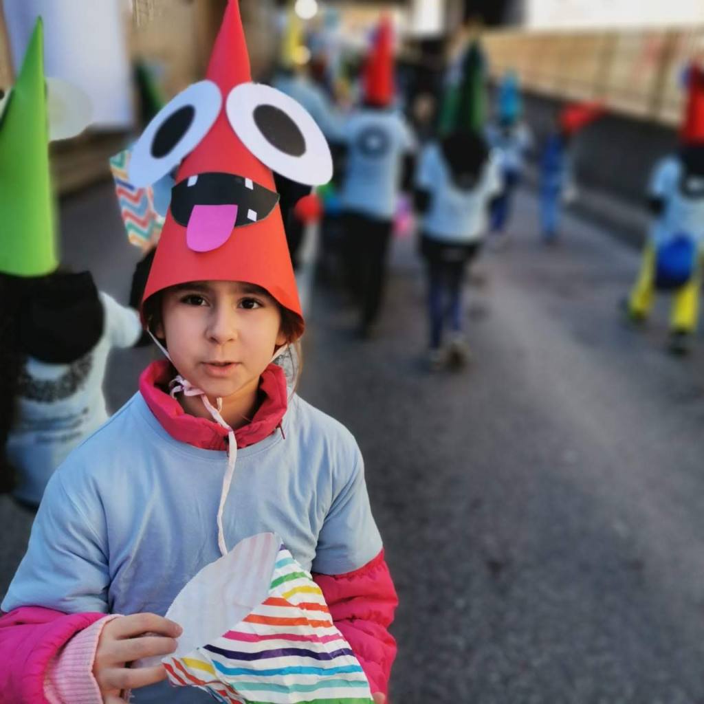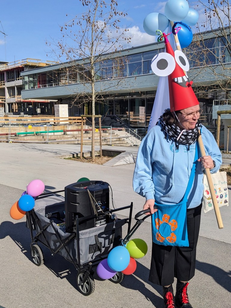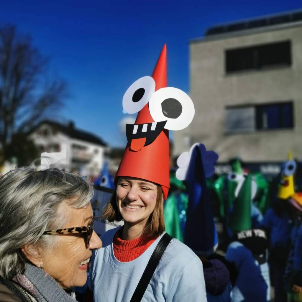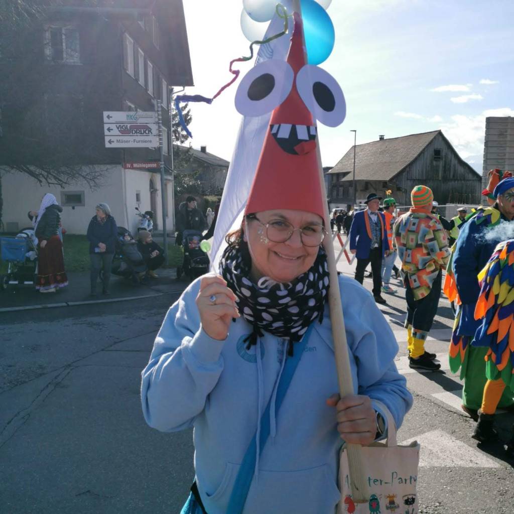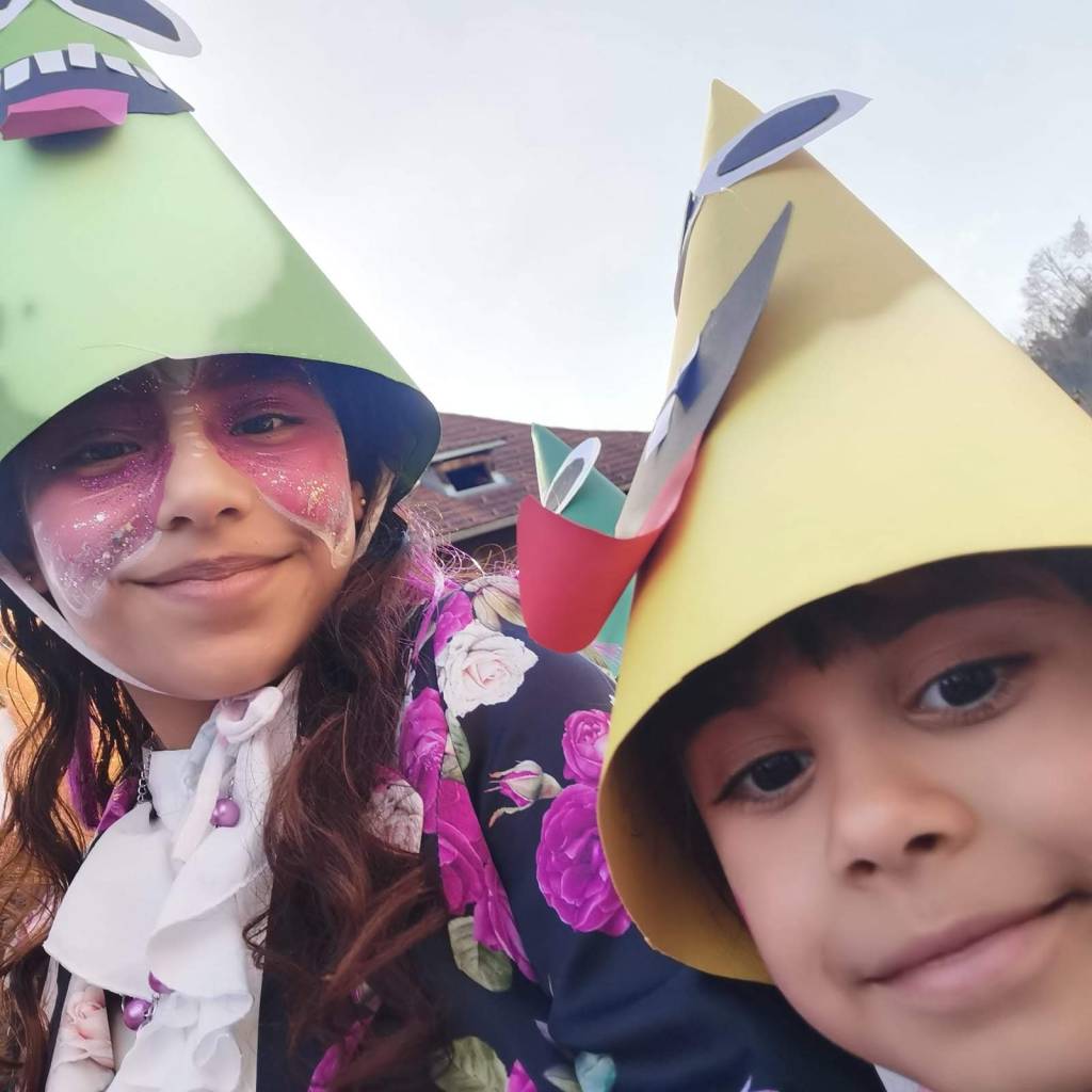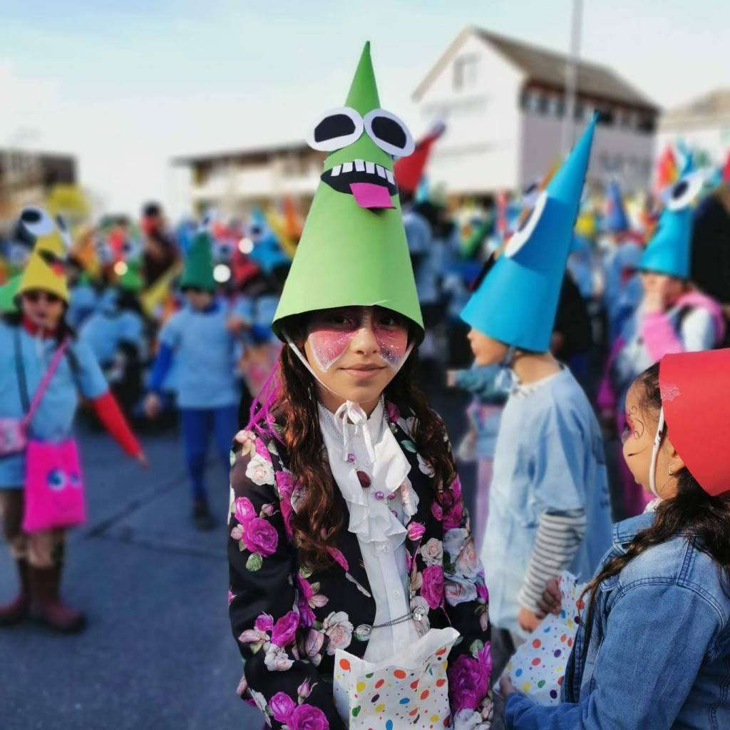Von der Schule aus ging es dann direkt zur Aufstellung. Als Nummer 2 lief die Volksschule, als größte Gruppe des traditionellen Schottar-Umzugs. Die Kinder, Lehrpersonen und Eltern hatten sehr viel Spaß, tanzten zur Musik den Monstertanz und verteilten Bonbons.