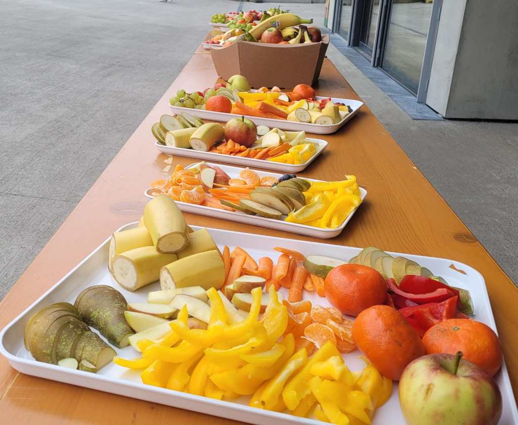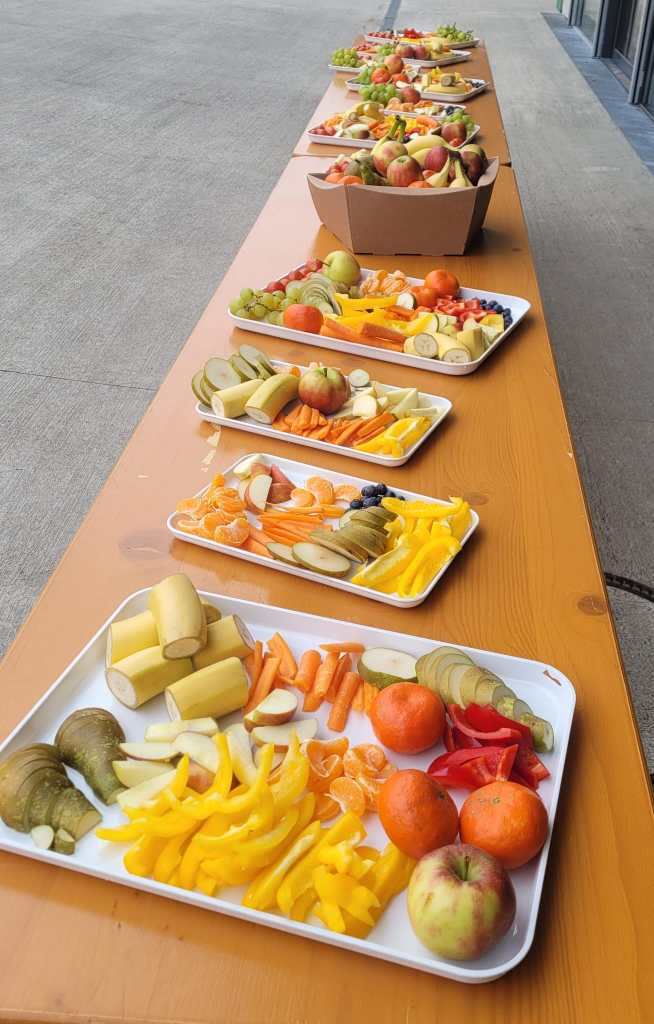 Einmal im Monat freuen sich die Schülerinnen und Schüler über ein großes gesundes Buffet mit Obst und Gemüse.