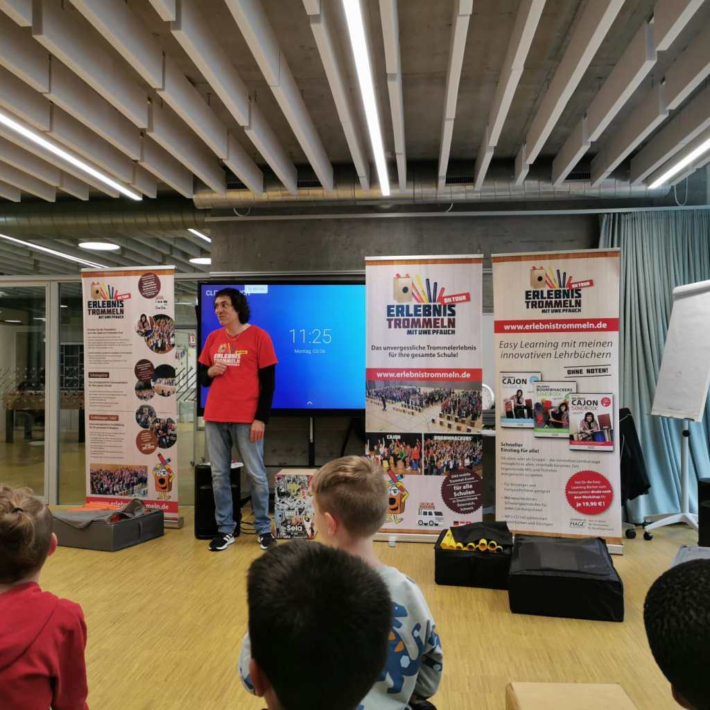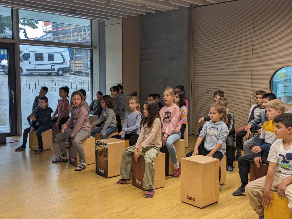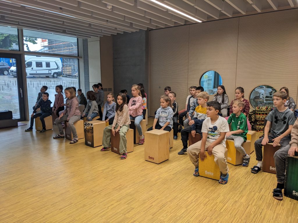 Eine besondere Woche steht den Schülerinnen und Schülern bevor. Die ersten Klassen starteten heute bereits mit dem Trommelworkshop. Die ganze Woche über lernen die Kinder auf Cajons Rhytmen und Trommeltechnik mit Uwe Pfauch. Die Eltern freuen sich bereits jetzt auf die Abschlusspräsentation im Rahmen des Schulfestes am Freitag Nachmittag.