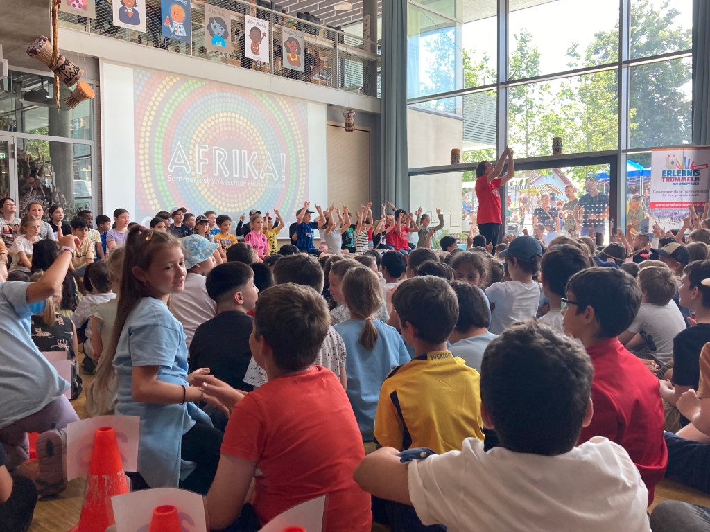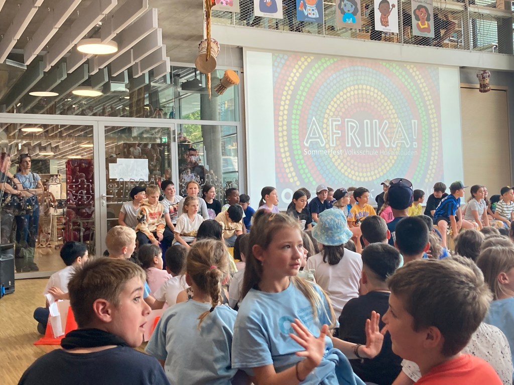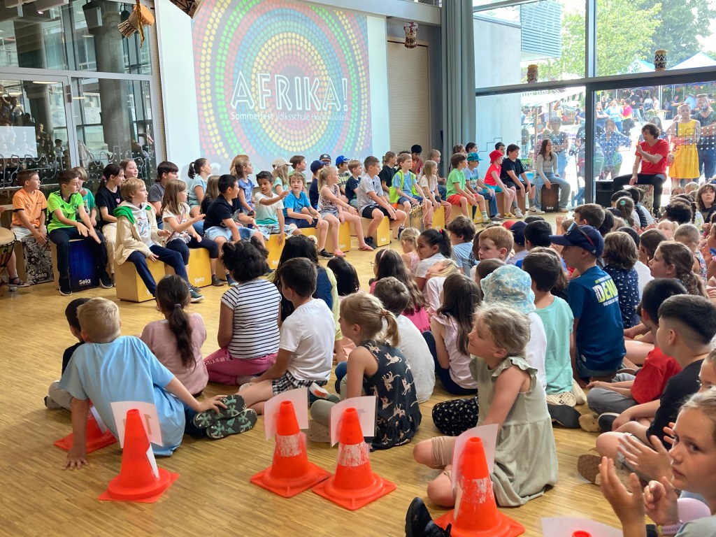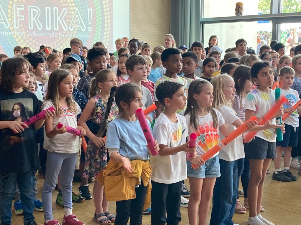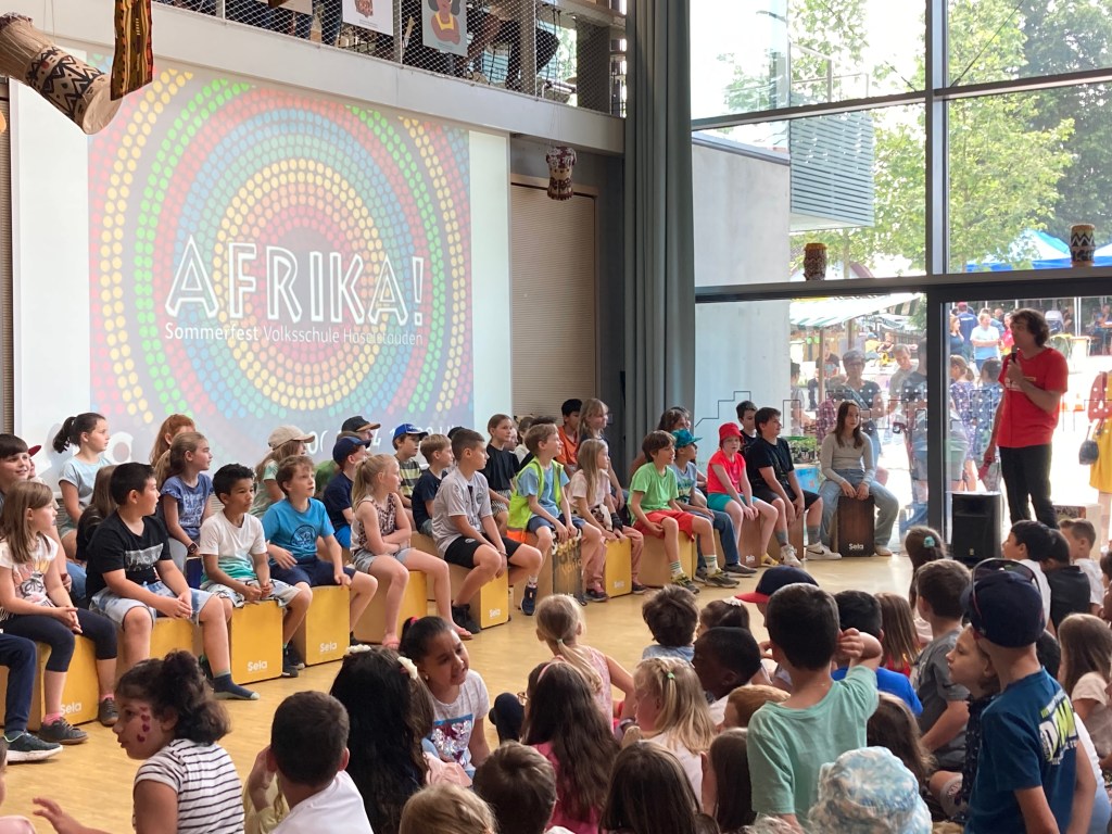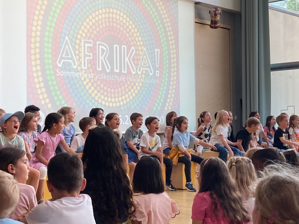 Am Freitag, den 7. Juni fand das diesjährige Sommerfest unter dem Motto „AFRIKA!“ an der VS Haselstauden statt. Die Vorbereitungen starteten bereits einige Wochen zuvor. Mit Vorträgen von PAMOJA (ein gemeinnütziger Verein zur Förderung der Bildung, Gesundheit & Entwicklung in Afrika) wurden die Schülerinnen und Schüler an das Thema herangeführt. Am Montag vor dem Schulfest lernten die Kinder dann Uwe Pfauch (Erlebnistrommeln) kennen. Uwe kam mit seinem Wohnmobil und ca 50 Cajons, um mit den Schulkindern Rhymen und Trommeln zu üben. Das Erlernte wurde im Rahmen des Schulfestes in einem großen Trommelkonzert präsentiert. Da die Wettervorhersage unbeständig war, wurde kurzfristig entschieden, dass das Schulfest an und in der Schule stattfinden wird. So wurde es zum Konzert kuschelig in der Aula, für die SchülerInnen, sowie für die Eltern, Freunde und Verwandte.