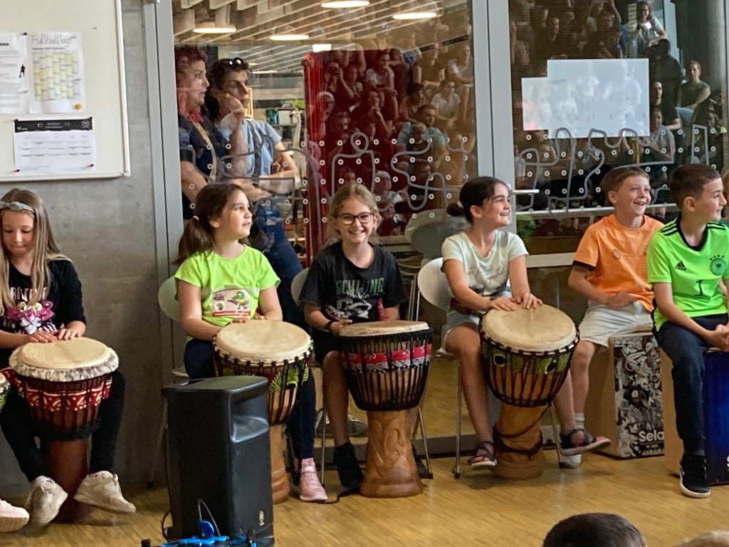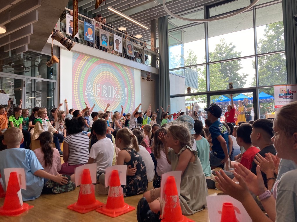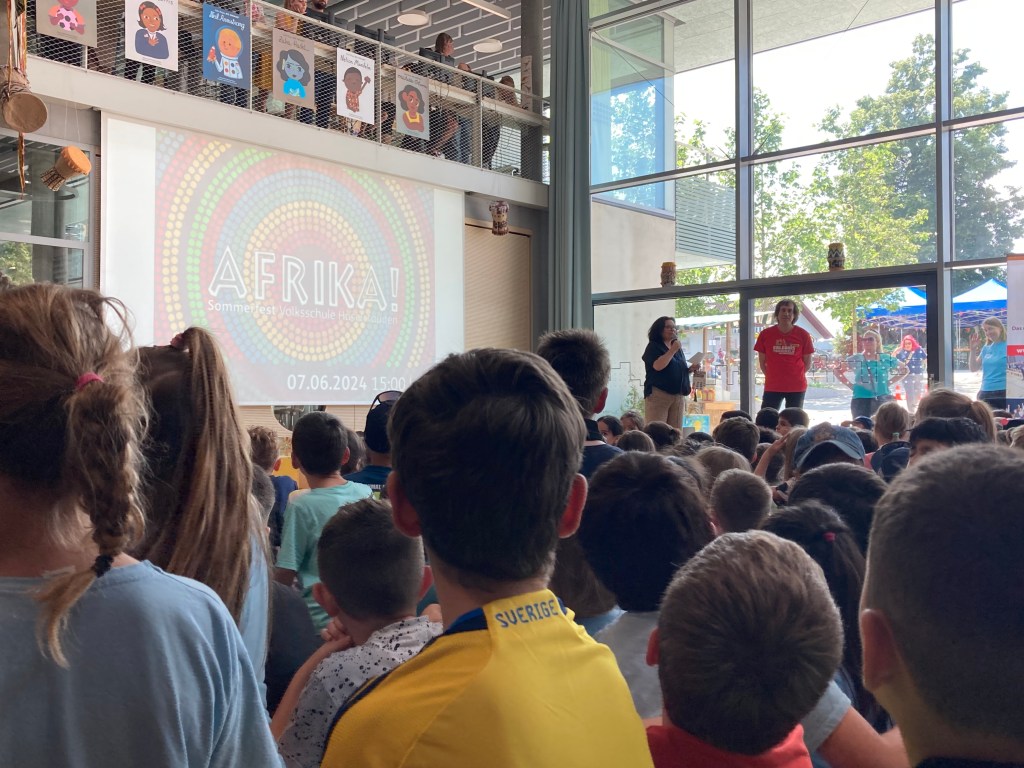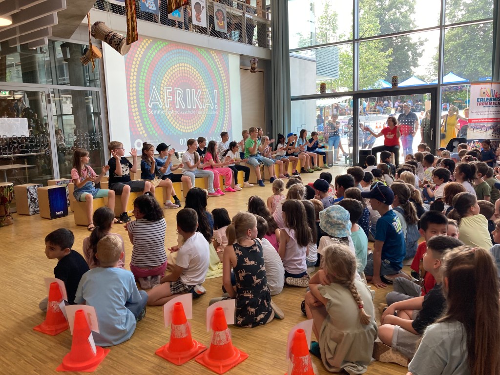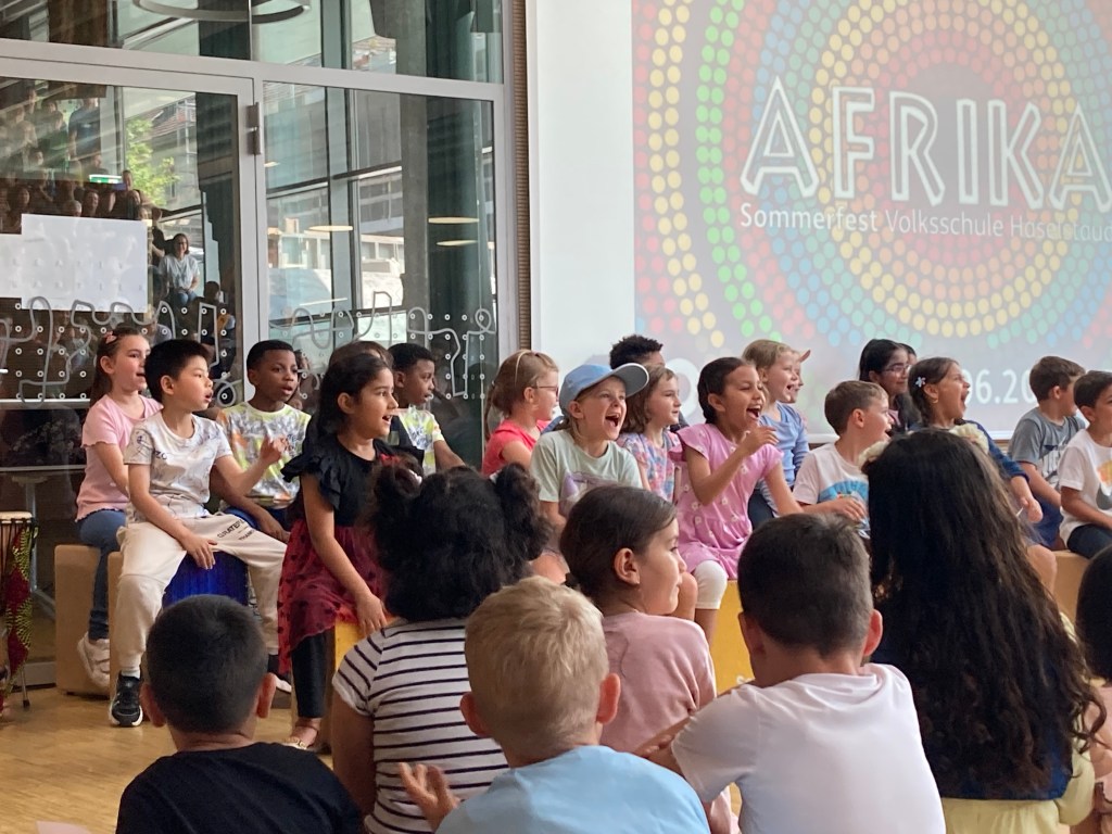 Am Freitag, den 7. Juni fand das diesjährige Sommerfest unter dem Motto „AFRIKA!“ an der VS Haselstauden statt. Die Vorbereitungen starteten bereits einige Wochen zuvor. Mit Vorträgen von PAMOJA (ein gemeinnütziger Verein zur Förderung der Bildung, Gesundheit & Entwicklung in Afrika) wurden die Schülerinnen und Schüler an das Thema herangeführt. Am Montag vor dem Schulfest lernten die Kinder dann Uwe Pfauch (Erlebnistrommeln) kennen. Uwe kam mit seinem Wohnmobil und ca 50 Cajons, um mit den Schulkindern Rhymen und Trommeln zu üben. Das Erlernte wurde im Rahmen des Schulfestes in einem großen Trommelkonzert präsentiert. Da die Wettervorhersage unbeständig war, wurde kurzfristig entschieden, dass das Schulfest an und in der Schule stattfinden wird. So wurde es zum Konzert kuschelig in der Aula, für die SchülerInnen, sowie für die Eltern, Freunde und Verwandte.
