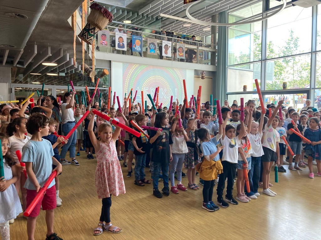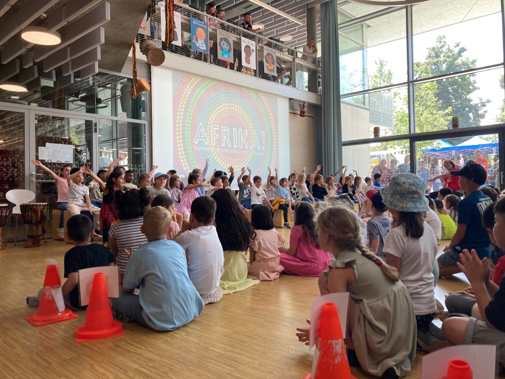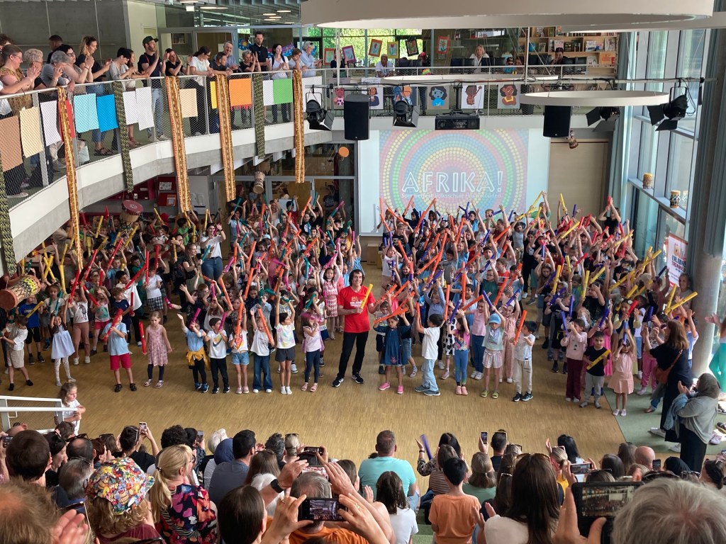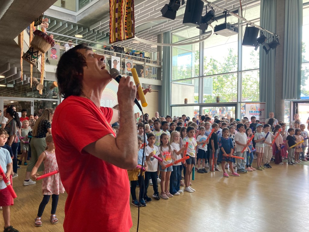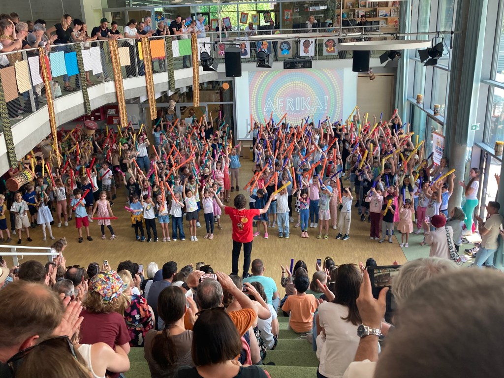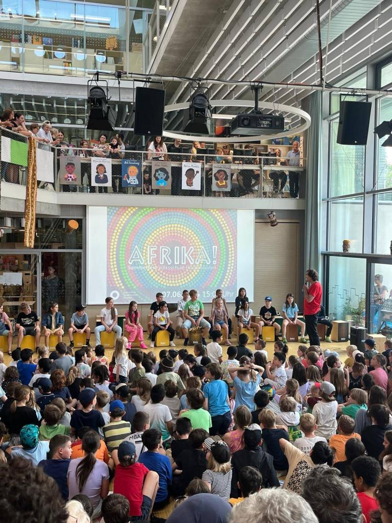 Am Freitag, den 7. Juni fand das diesjährige Sommerfest unter dem Motto „AFRIKA!“ an der VS Haselstauden statt. Die Vorbereitungen starteten bereits einige Wochen zuvor. Mit Vorträgen von PAMOJA (ein gemeinnütziger Verein zur Förderung der Bildung, Gesundheit & Entwicklung in Afrika) wurden die Schülerinnen und Schüler an das Thema herangeführt. Am Montag vor dem Schulfest lernten die Kinder dann Uwe Pfauch (Erlebnistrommeln) kennen. Uwe kam mit seinem Wohnmobil und ca 50 Cajons, um mit den Schulkindern Rhymen und Trommeln zu üben. Das Erlernte wurde im Rahmen des Schulfestes in einem großen Trommelkonzert präsentiert. Da die Wettervorhersage unbeständig war, wurde kurzfristig entschieden, dass das Schulfest an und in der Schule stattfinden wird. So wurde es zum Konzert kuschelig in der Aula, für die SchülerInnen, sowie für die Eltern, Freunde und Verwandte.
