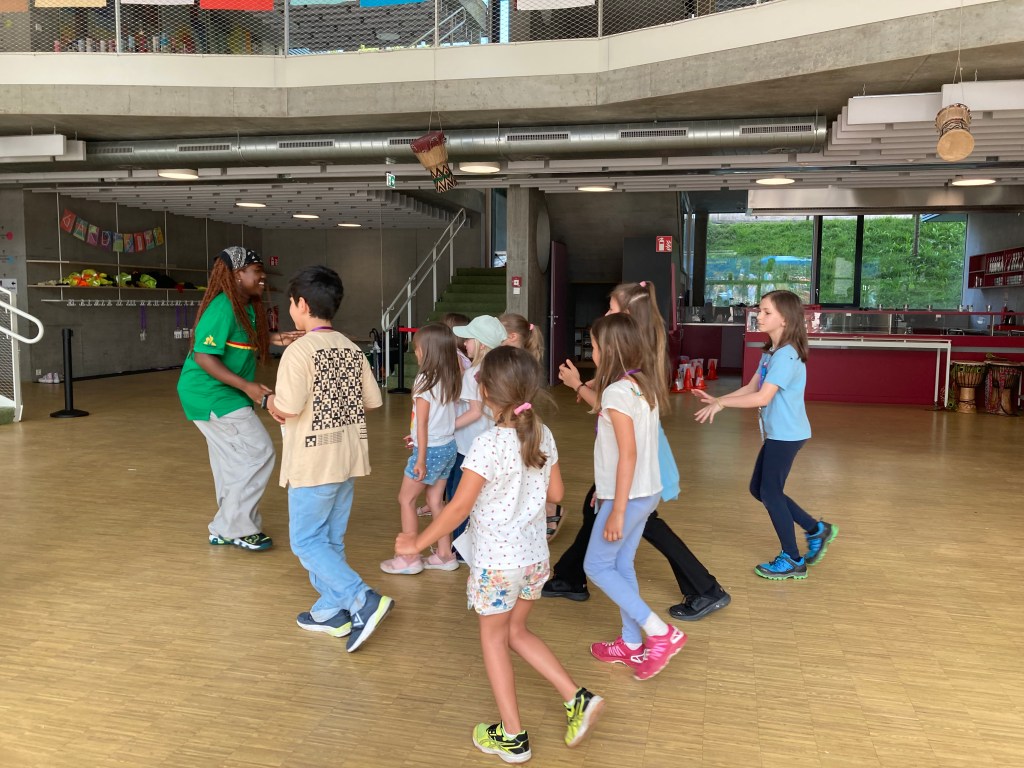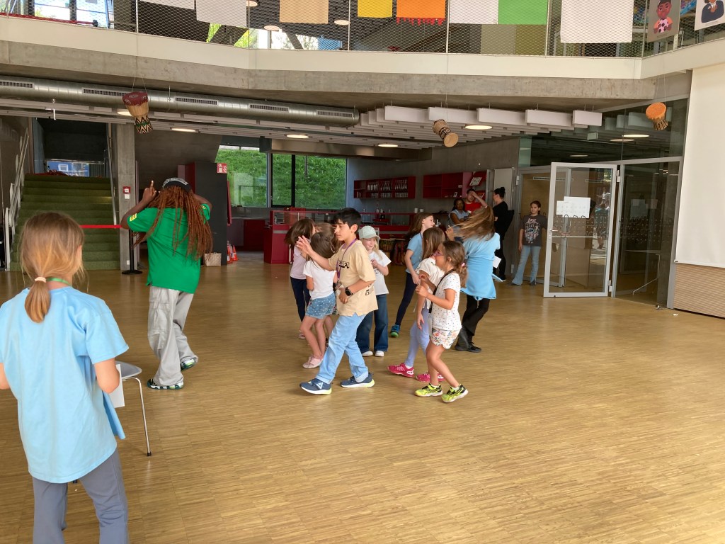 Naomi, die ein freiwilliges soziales Jahr in Österreich bei der OJAD macht, übte tanzen zu afrikanischer Musik in der Aula.