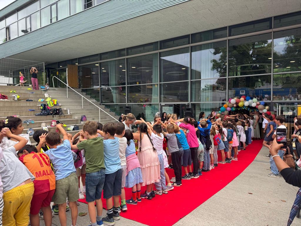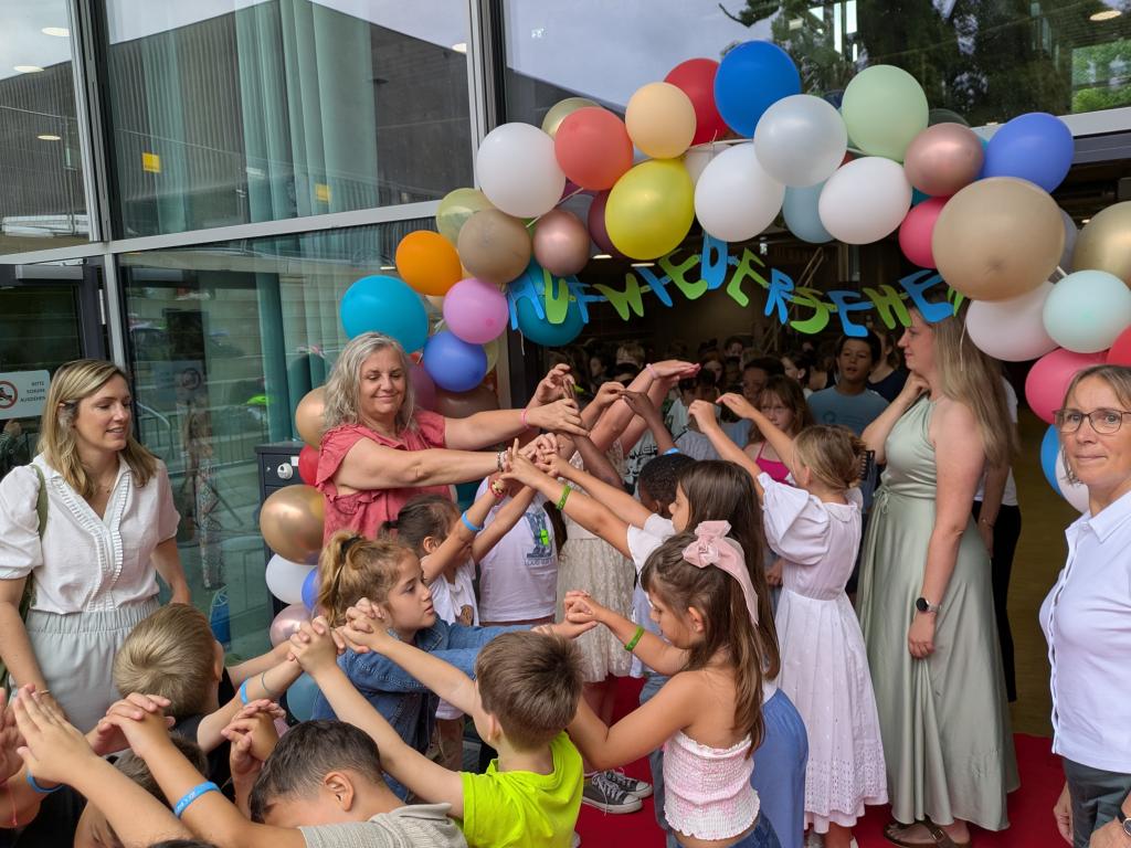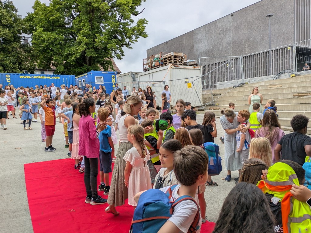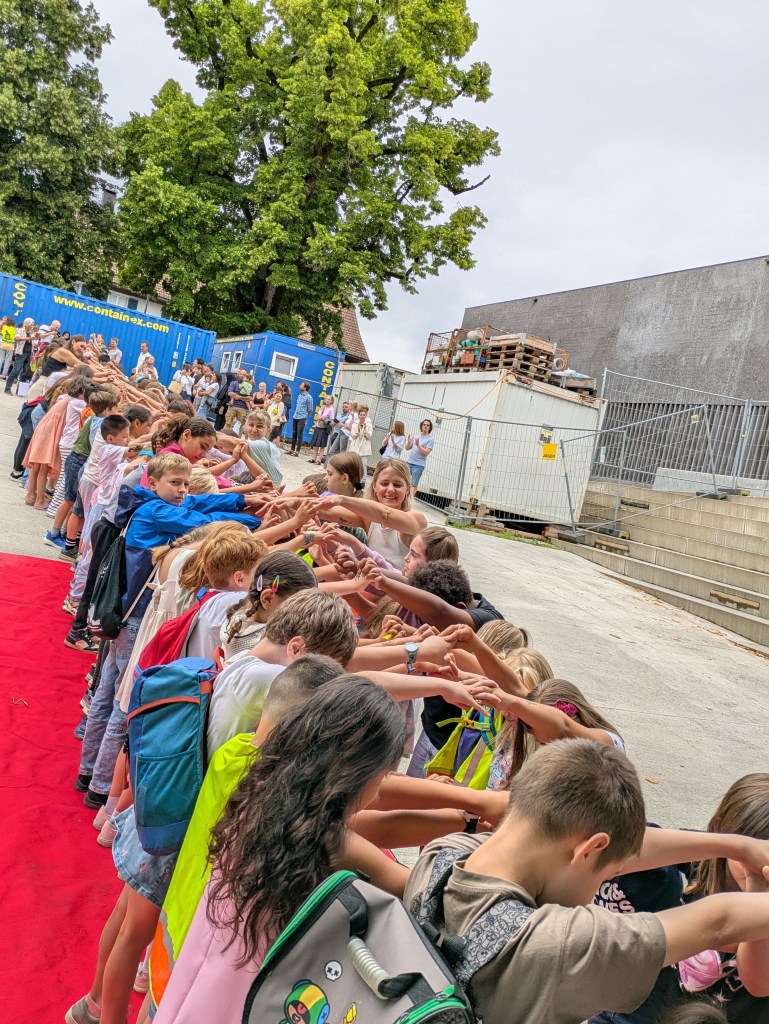 Nun hieß es aber Abschied nehmen. Die Vierklässer verließen ein letztes mal über den roten Teppich das Schulgebäude durch den Spalier.