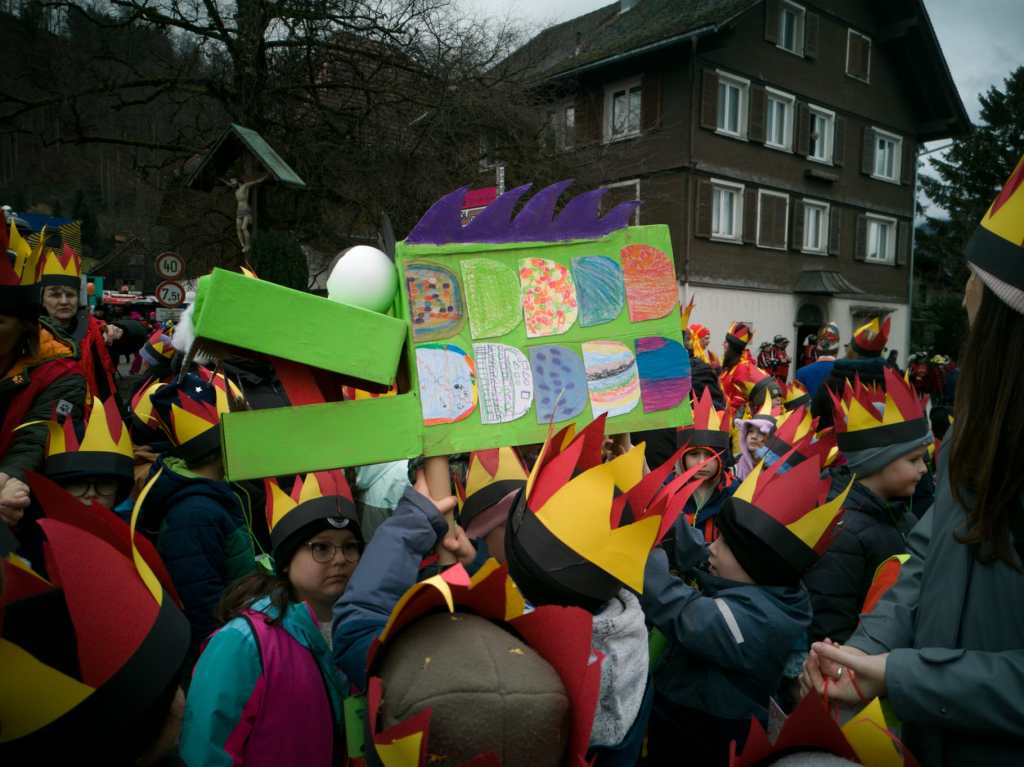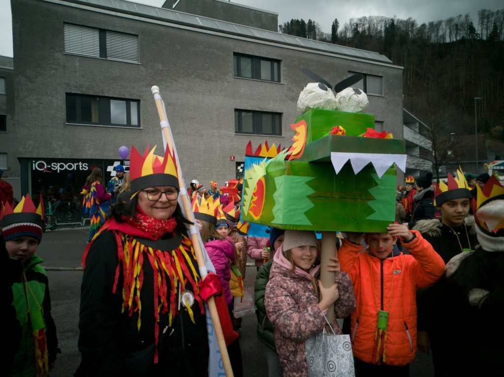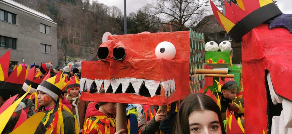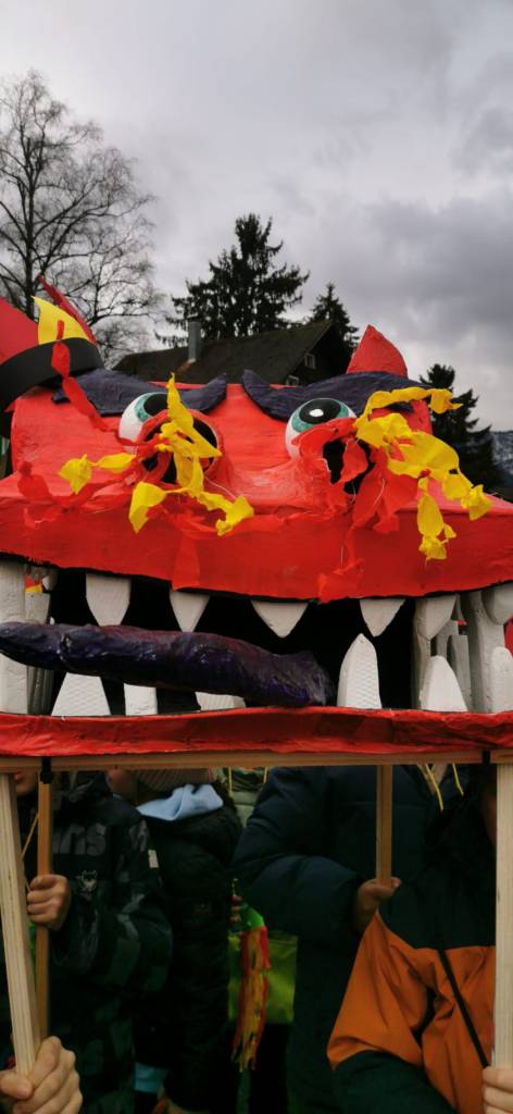 Die Kinder unserer Volksschule hatten nämlich fleißig gebastelt. Jede Klasse brachte ihren eigenen, selbstgemachten Drachen zum Faschingsumzug mit. Und die waren richtig cool! Es gab Drachen in allen Größen, mit langen Schwänzen, mit scharfen Zähnen, mit Glitzer-Schuppen und sogar mit Feuer aus Papier in Mund und Nase. Manche sahen ein bisschen gruselig aus, andere total lustig – aber alle waren einfach großartig.