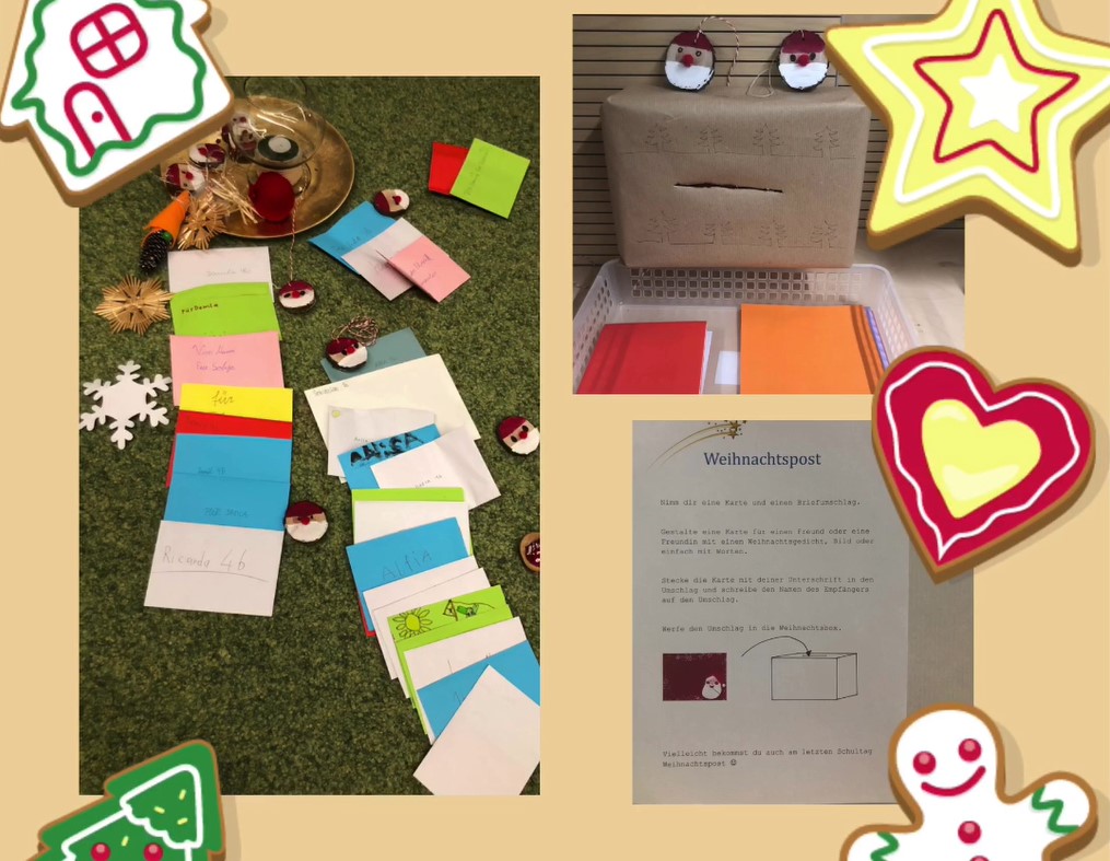 In den vergangenen Tagen konnten die Schüler Wichtelpost an ihre Mitschüler versenden, indem sie ein Bild oder Text auf eine Karte geschrieben, in einen Briefumschlag gesteckt und den Empfänger auf den Umschlag geschrieben haben. Diese Briefe hat der Wichtel heute dann verteilt.